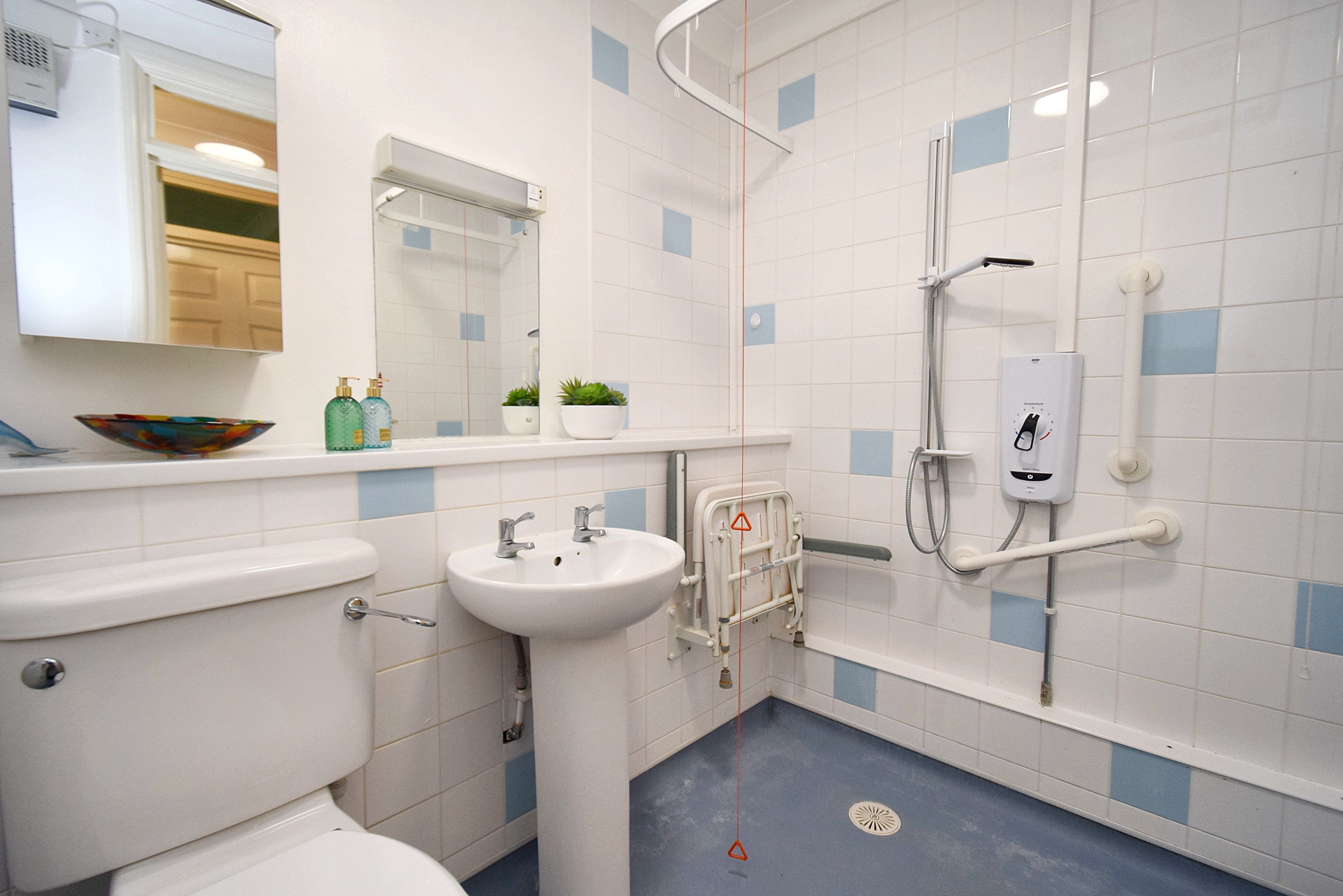 1.64m x 2.04m (5' 5" x 6' 8") Part-tiled and comprising low level WC, pedestal hand wash basin, wall-mounted mirror and mirrored cabinet, Mira electric shower, extractor fan.