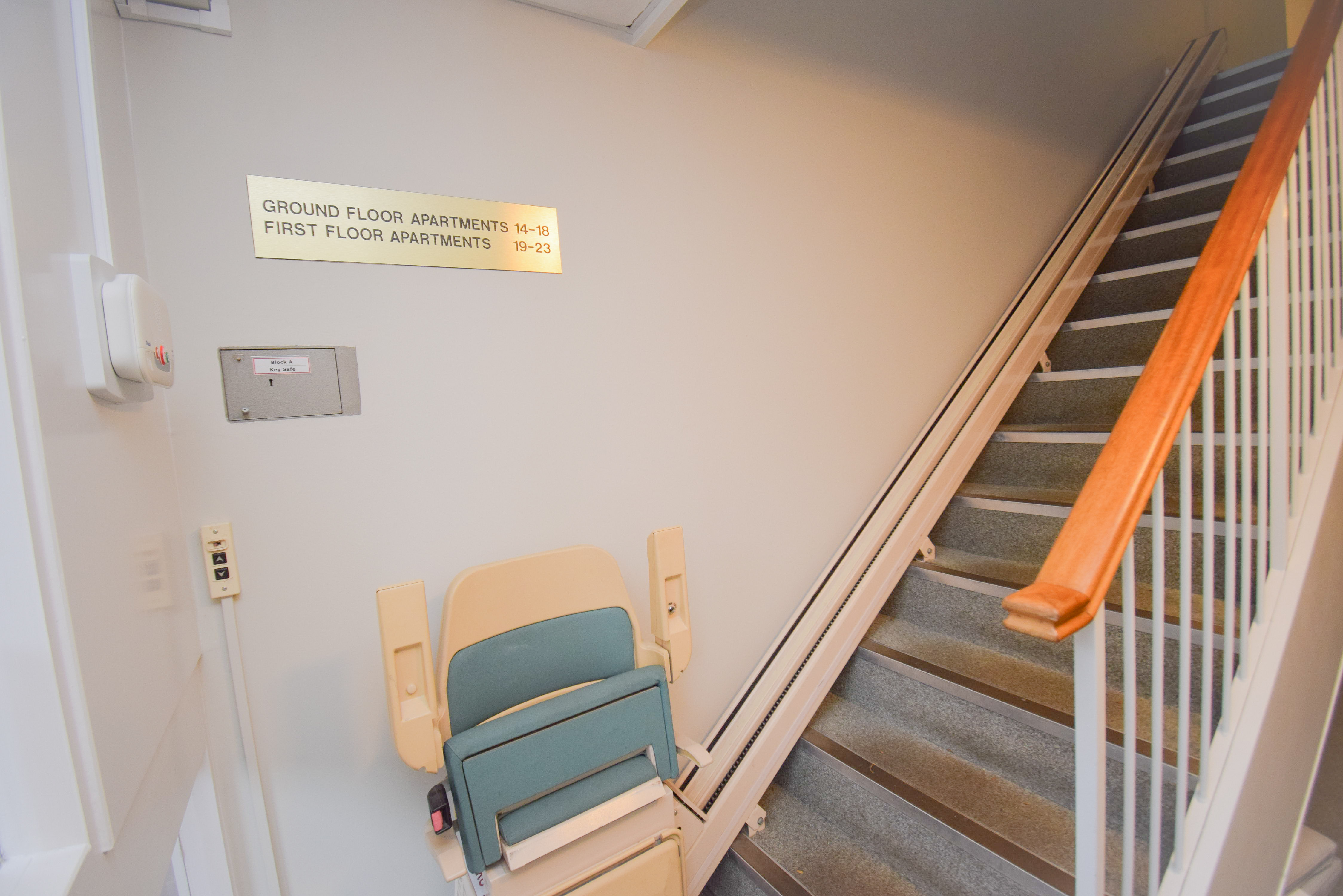 Stairs up to first floor with stair lift, automatic lighting, storage heater.