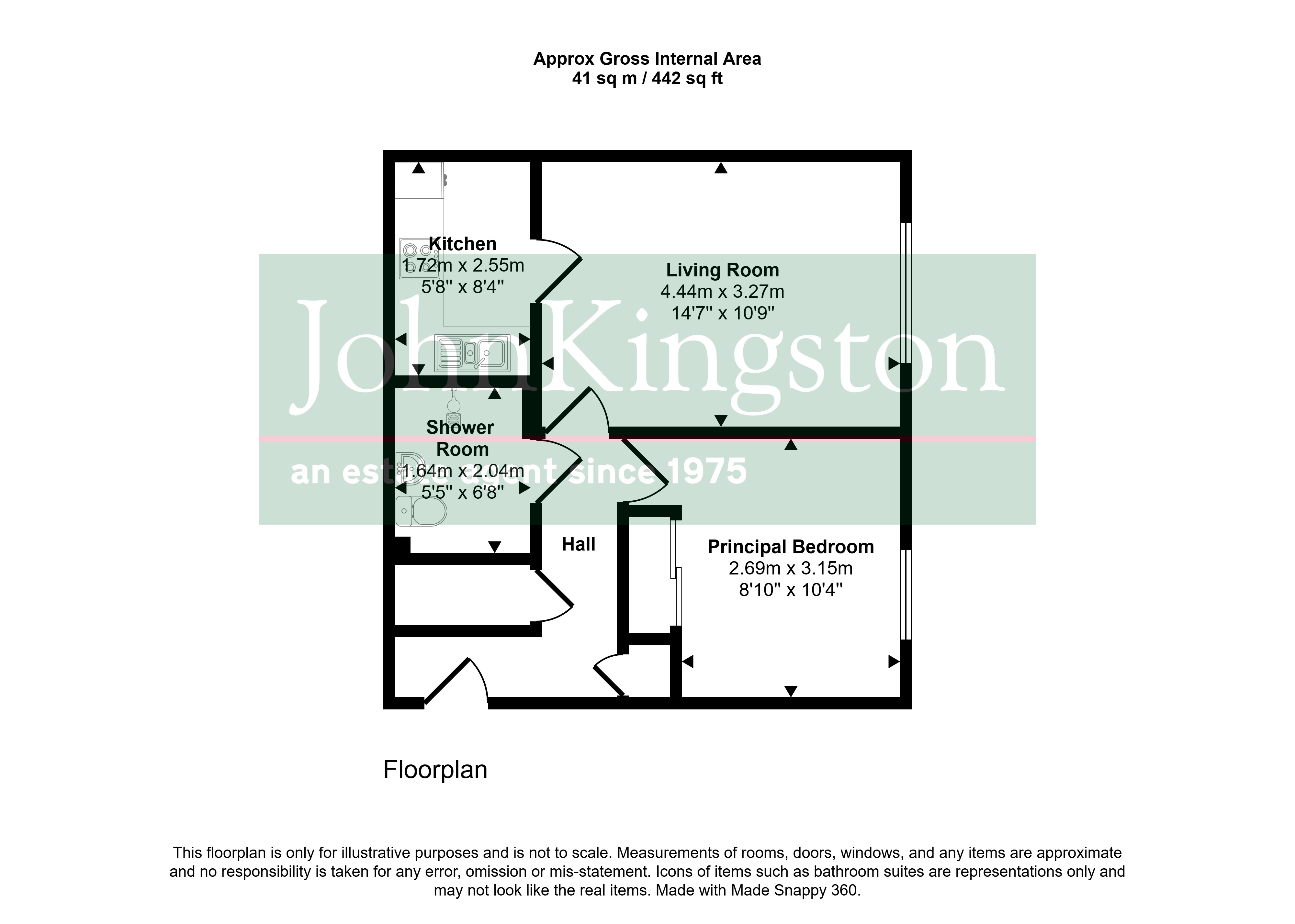 1.72m x 2.55m (5' 8" x 8' 4") Wall and base units with tiled splashback, under cabinet lighting, electric hob, extractor above, fitted oven, space for washing machine, space for freestanding fridge, stainless steel sink unit with single drainer, door to living room.