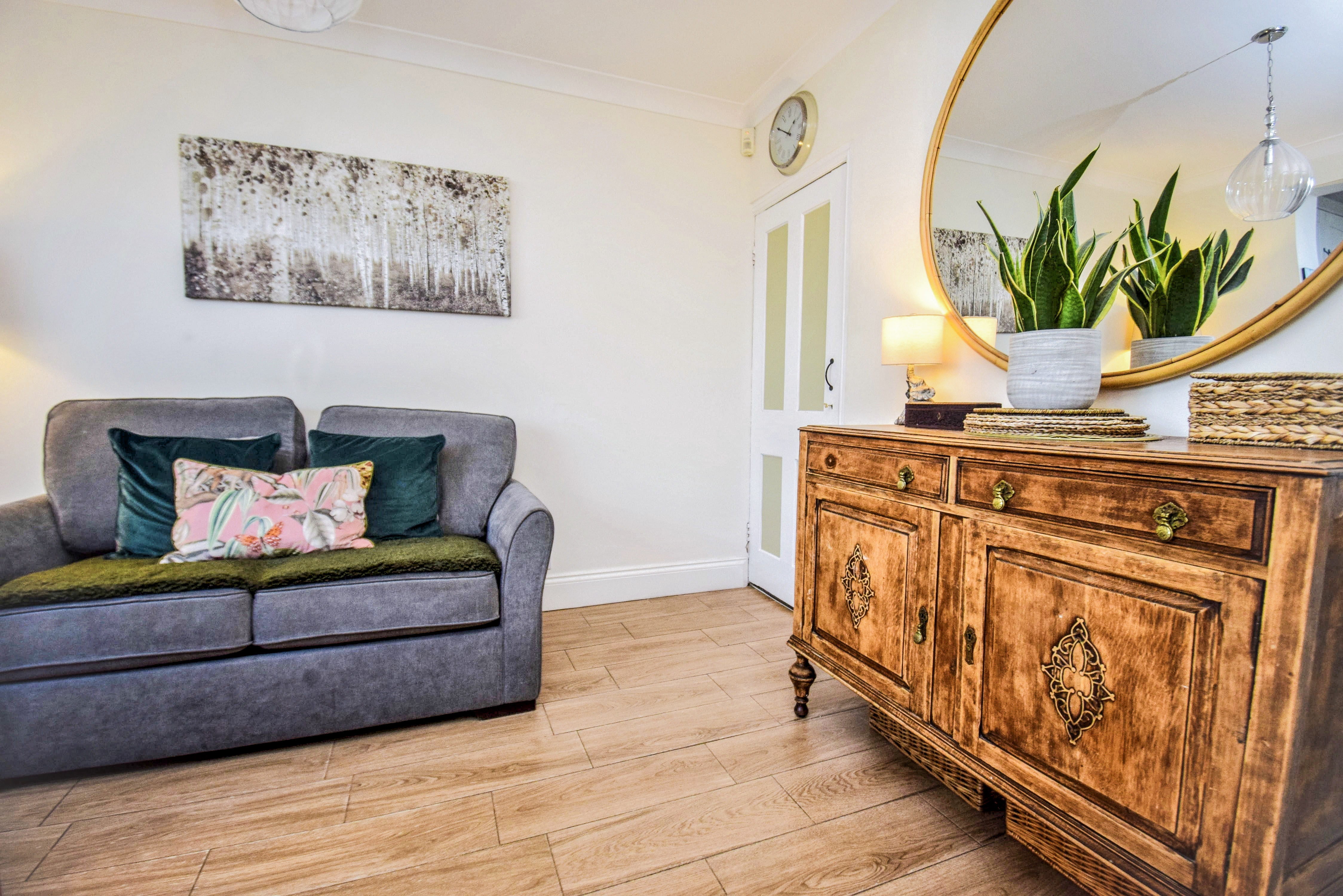 Doors to kitchen/dining room and sitting room, stairs to first floor, Amtico flooring, radiator, double glazed sash window to side.