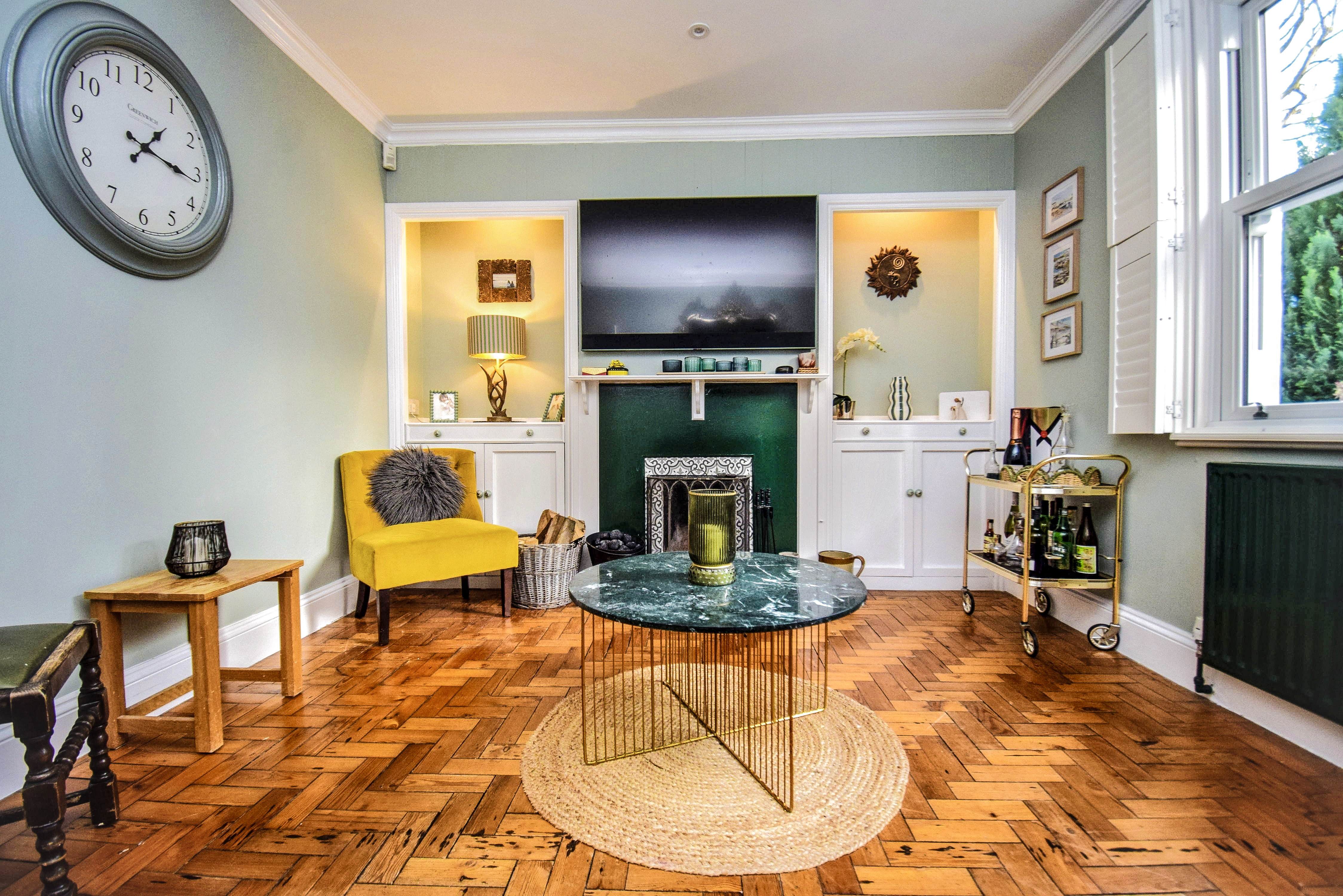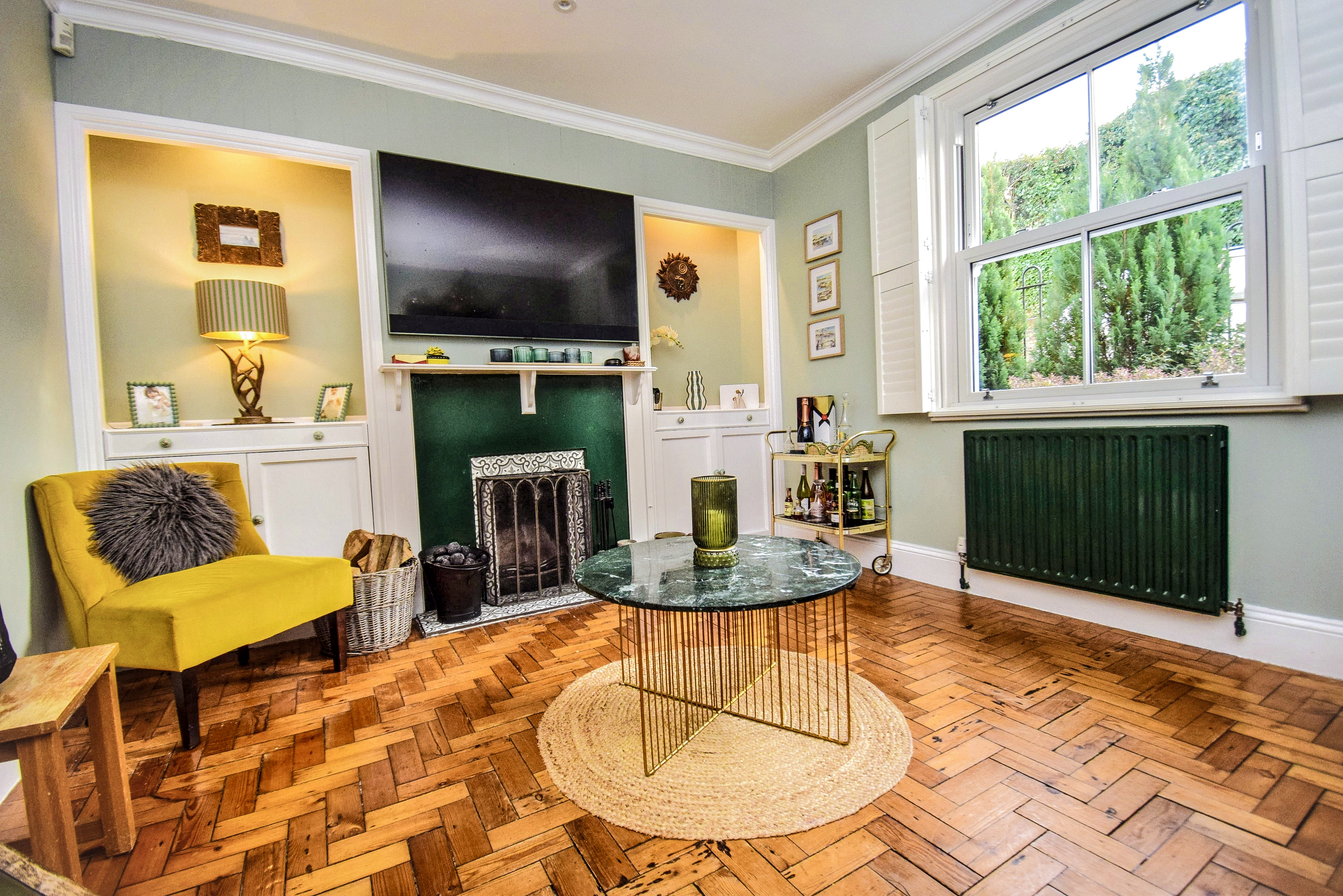 4.18m x 3.28m (13' 9" x 10' 9") Original parquet flooring, coving, double glazed sash window to front with plantation shutters, radiator, working open fireplace with tiled surround and hearth. There are fitted recess storage cupboards, one of which housing the consumer unit and electric meter, with concealed lighting above.