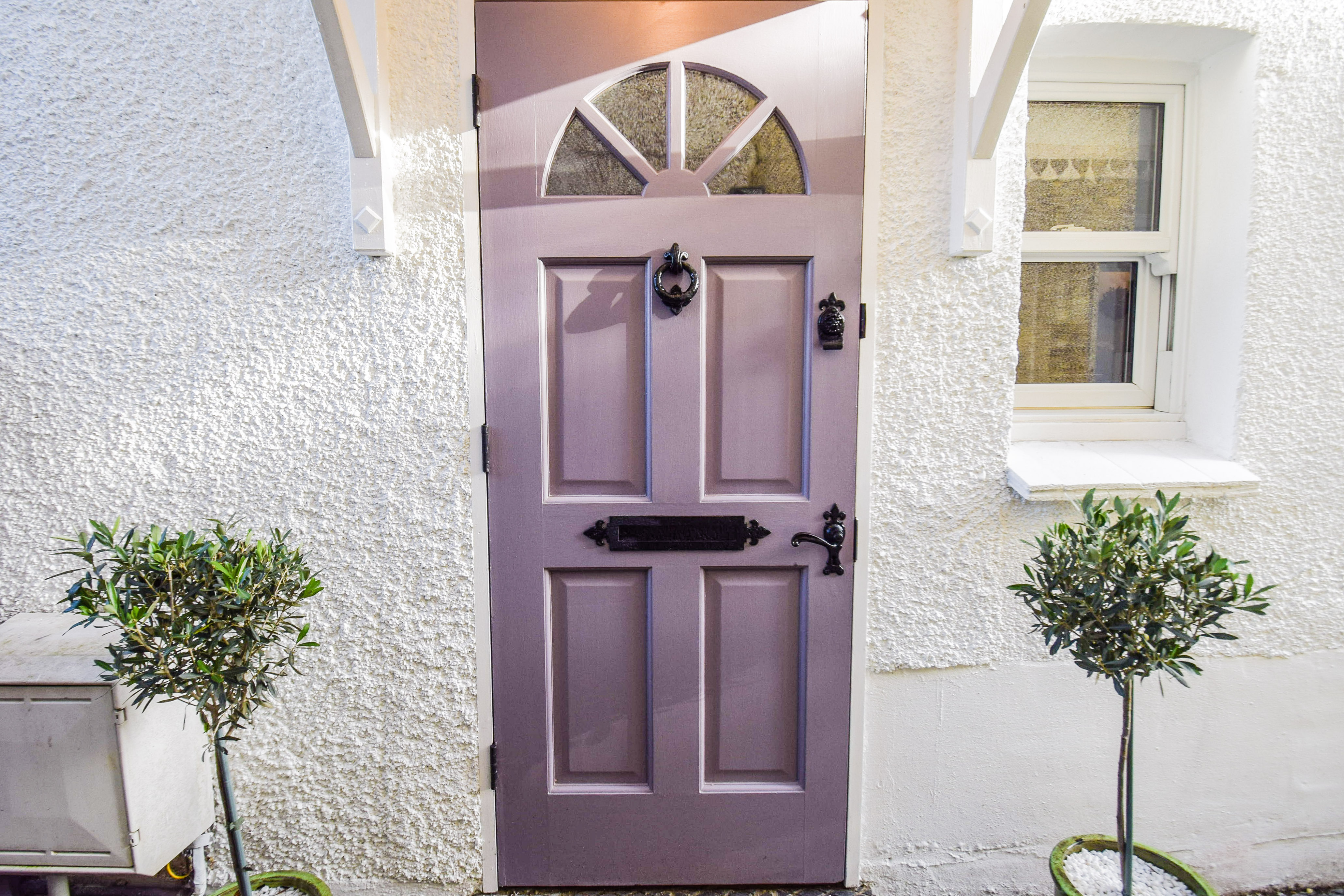 Accessed via gate with steps down, paved, planted border to front.