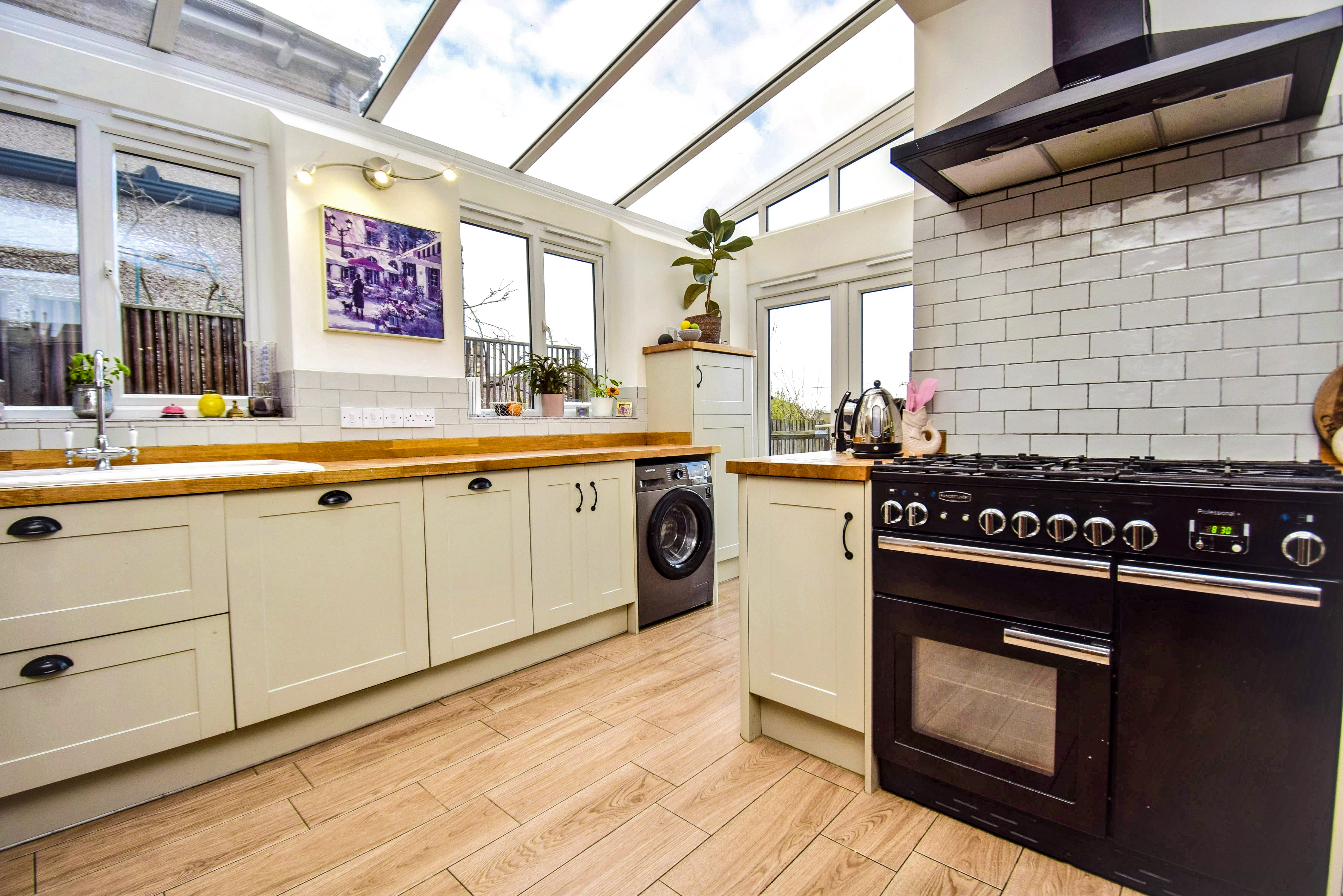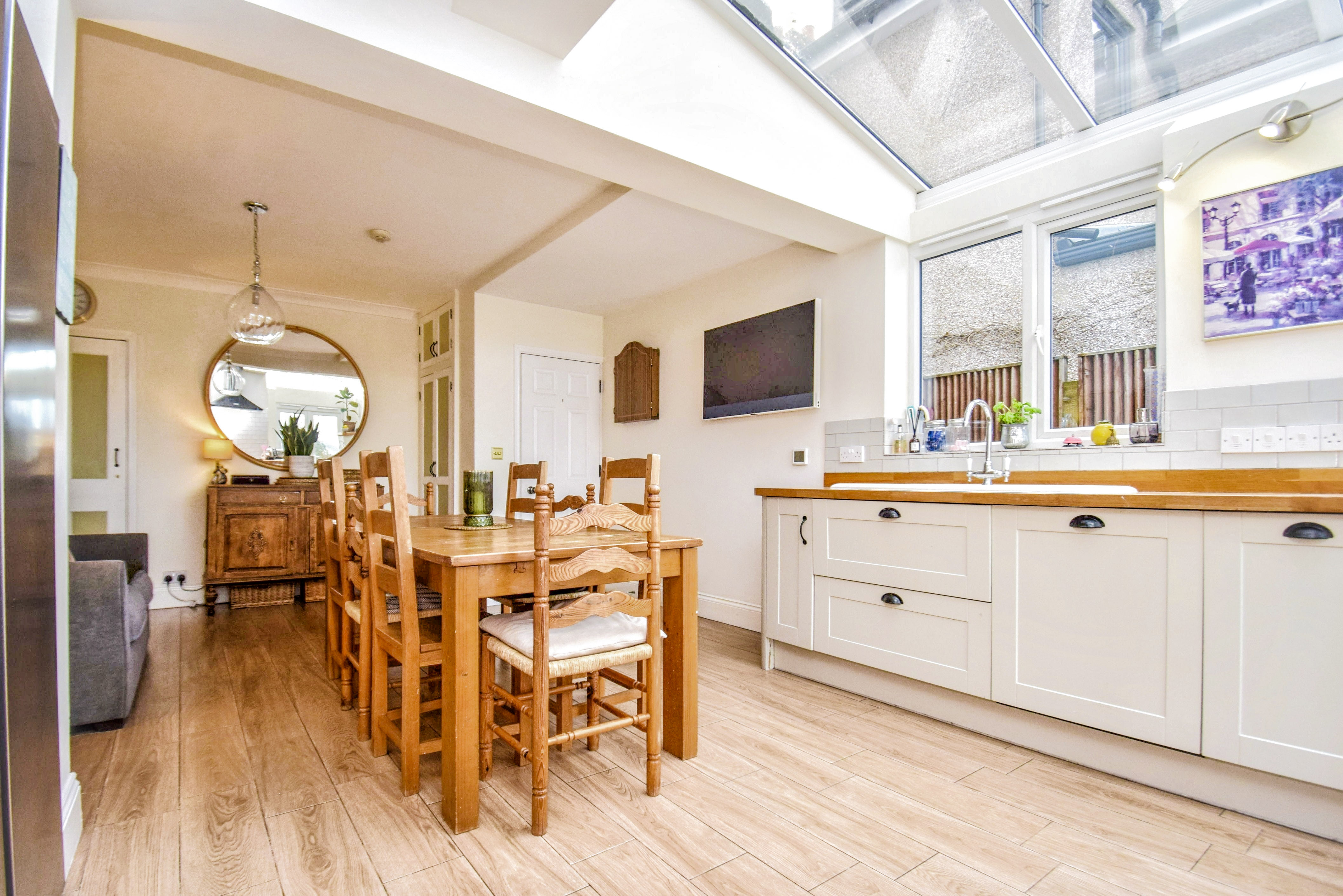 Dining Area: 4.16m x 3.79m (13' 8" x 12' 5"). Kitchen: 4.13m x 3.79m (13' 7" x 12' 5") Bright, airy and open, the superb kitchen and dining space provides an excellent space for communal family time or entertaining, featuring Amtico flooring with underfloor heating throughout and a partly vaulted glass roof. The kitchen comprises a range of wall and base units with Oak worktops incorporating a 1½ bowl ceramic sink unit with single drainer and mixer tap, tiled splashback, a fitted dishwasher, deep pan drawers, carousel unit, Rangemaster with a 5-ring gas hob and extractor hood, glass display cabinet, space for washing machine, space for American style fridge freezer, hidden waste storage, cupboard housing Worcester Bosch gas-fired boiler. There are French doors to the rear which lead out onto the patio, double glazed windows to the side, and a stripped wooden door to the cloakroom. The dining space is very generous and could be adapted to suit individual needs, with coving, doors to a storage cupboard with shelving, and an understairs cupboard with light, shelving and space for a tumble dryer.