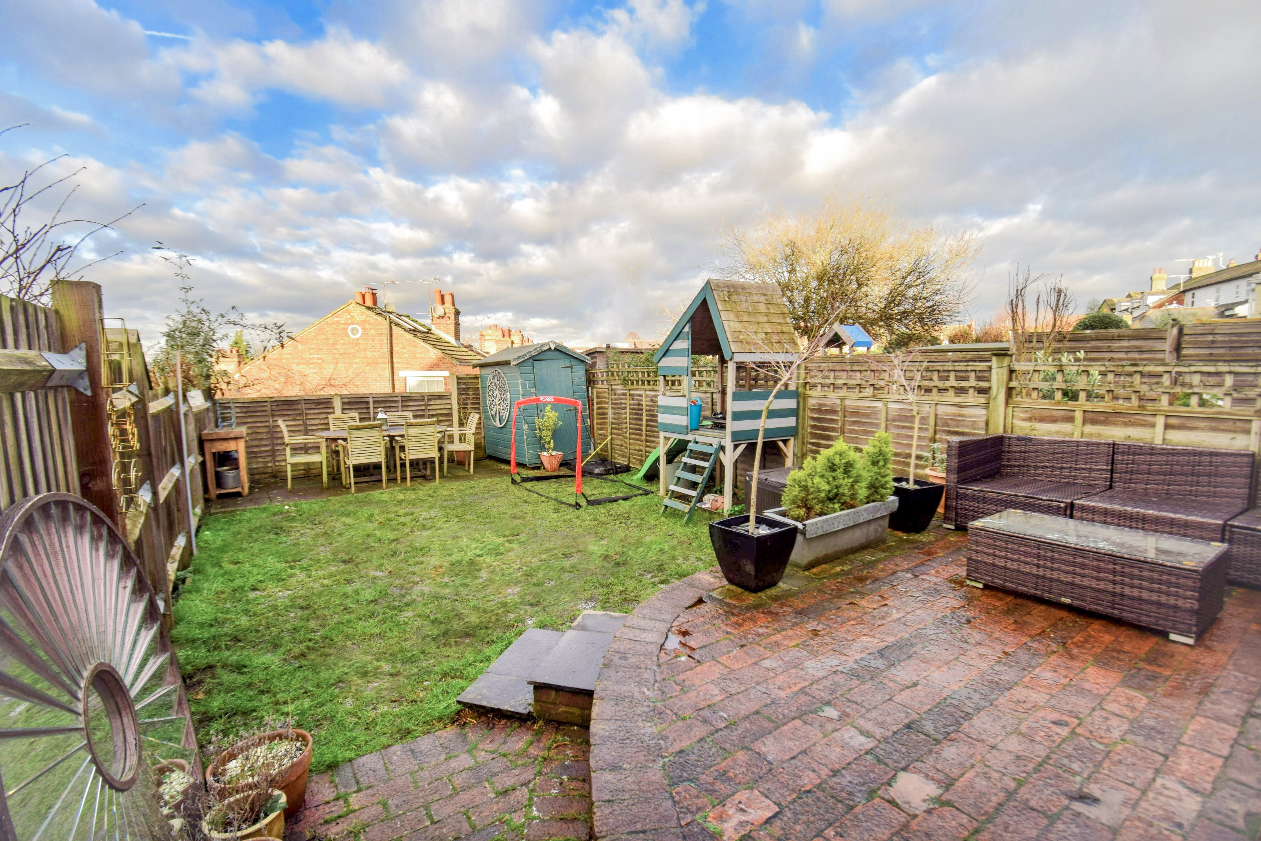 Featuring more superb and far-reaching views. The rear garden has a brick patio and and an area of lawn. It is of good size for this style of property. There is a side gate to provide access from the front.