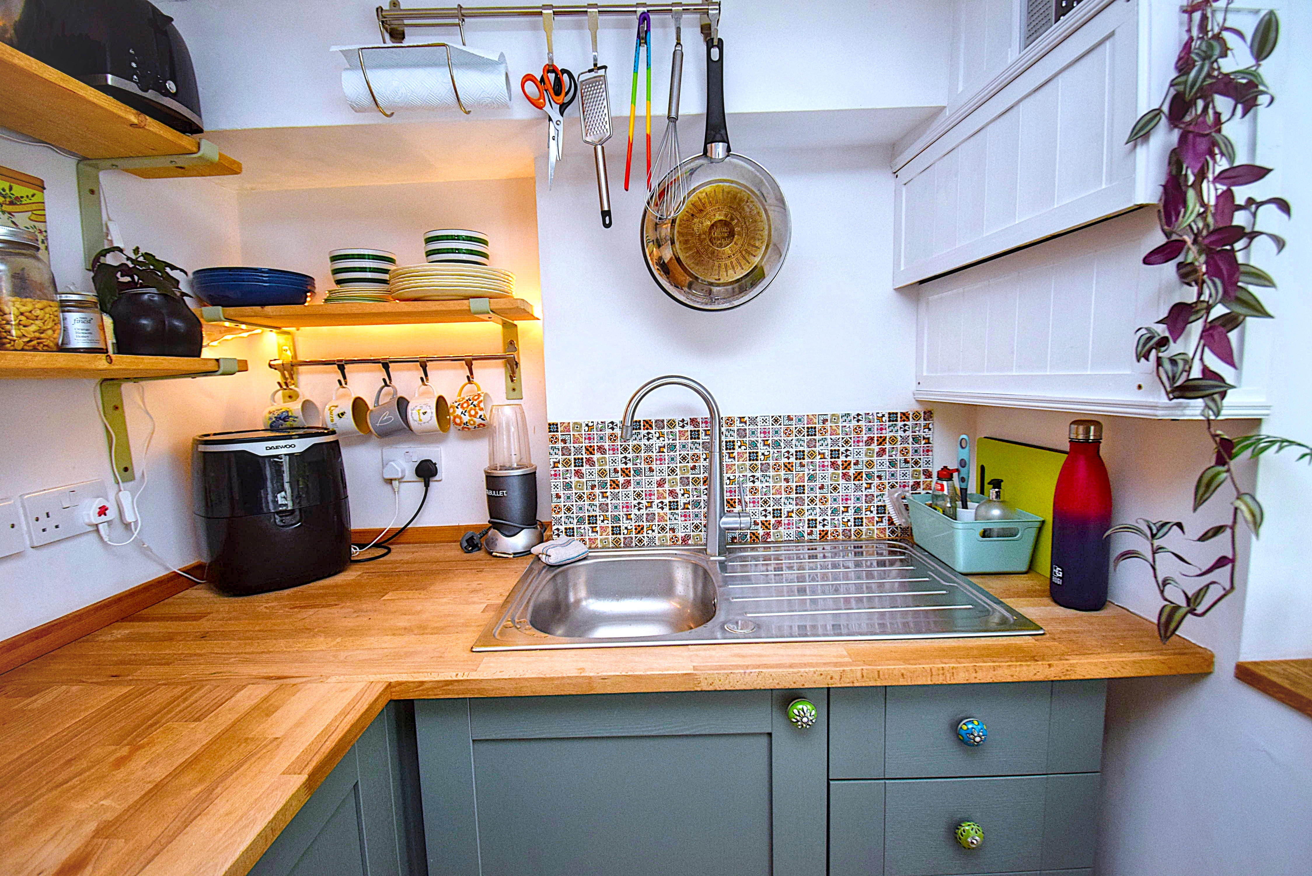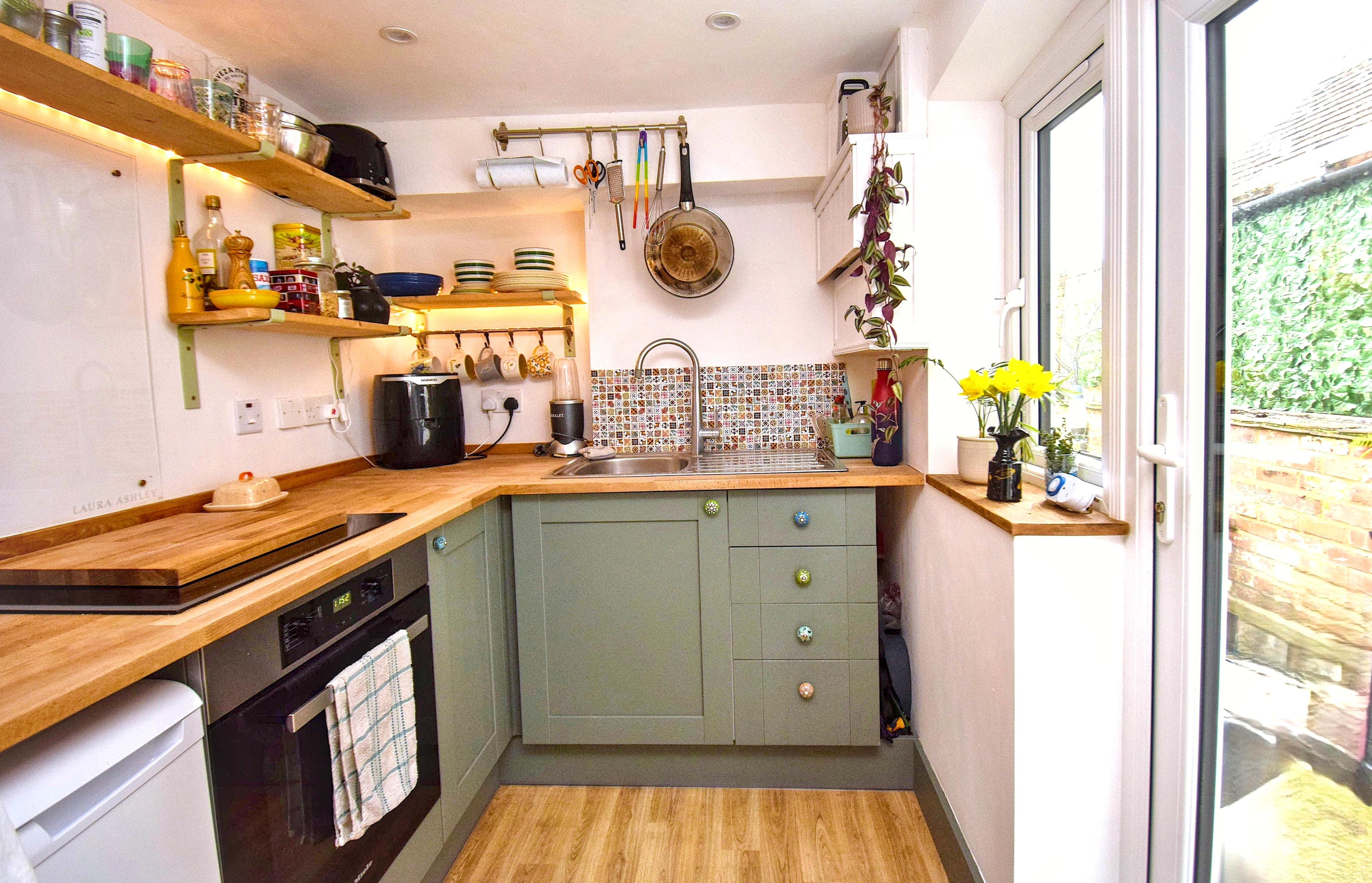 7' 1" x 5' 8" (2.16m x 1.73m) Fitted with matching Shaker style wall and base units with wood worktops, feature tiling, Electric Miele oven, Electric Neff hob, stainless steel single drainer sink unit, space for under counter fridge, double glazed door to garden.