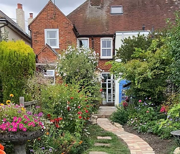 Small and pretty front garden with shingle pathway leading to front door and bordered central feature planting.