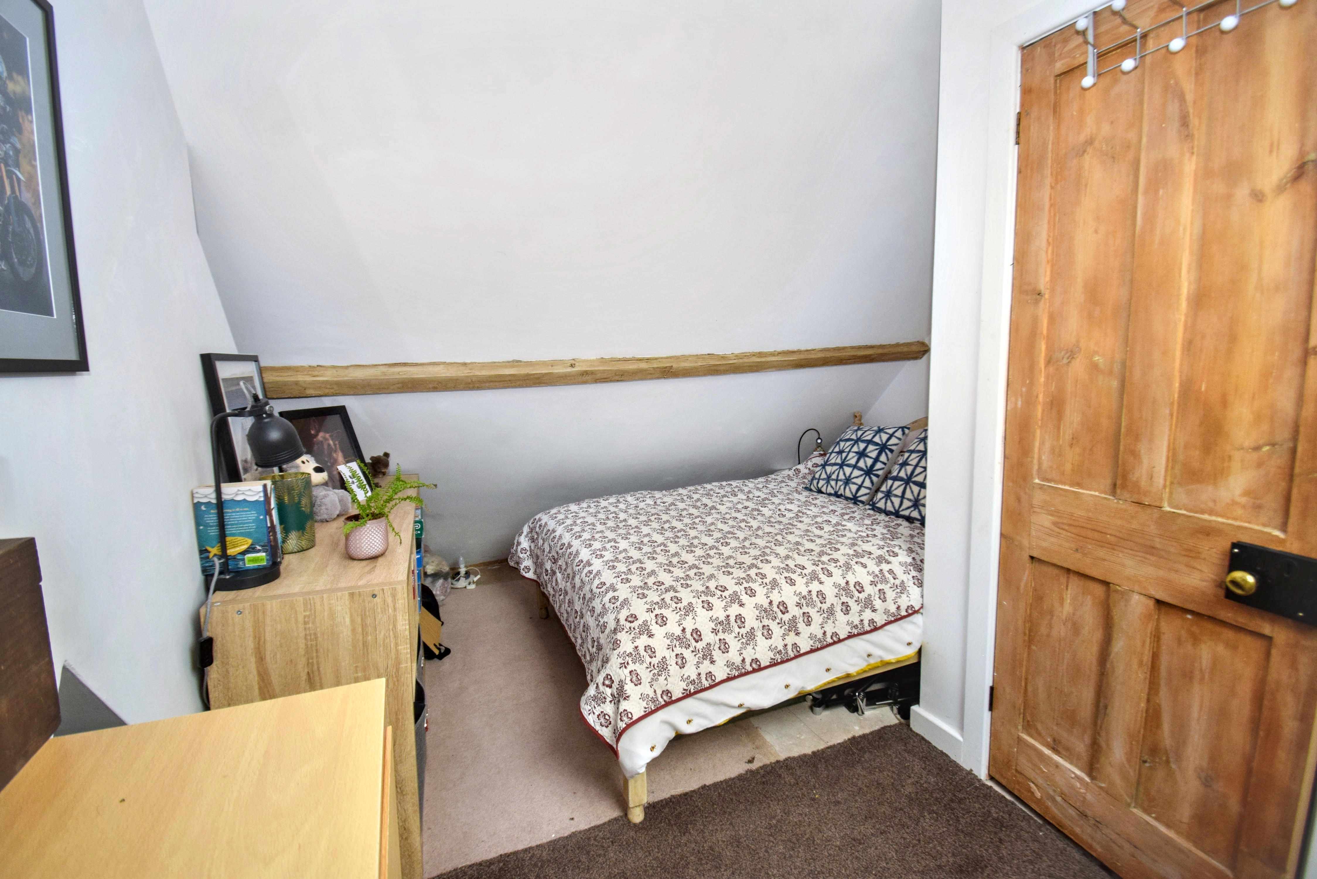 Door to Loft room, shelving for storage