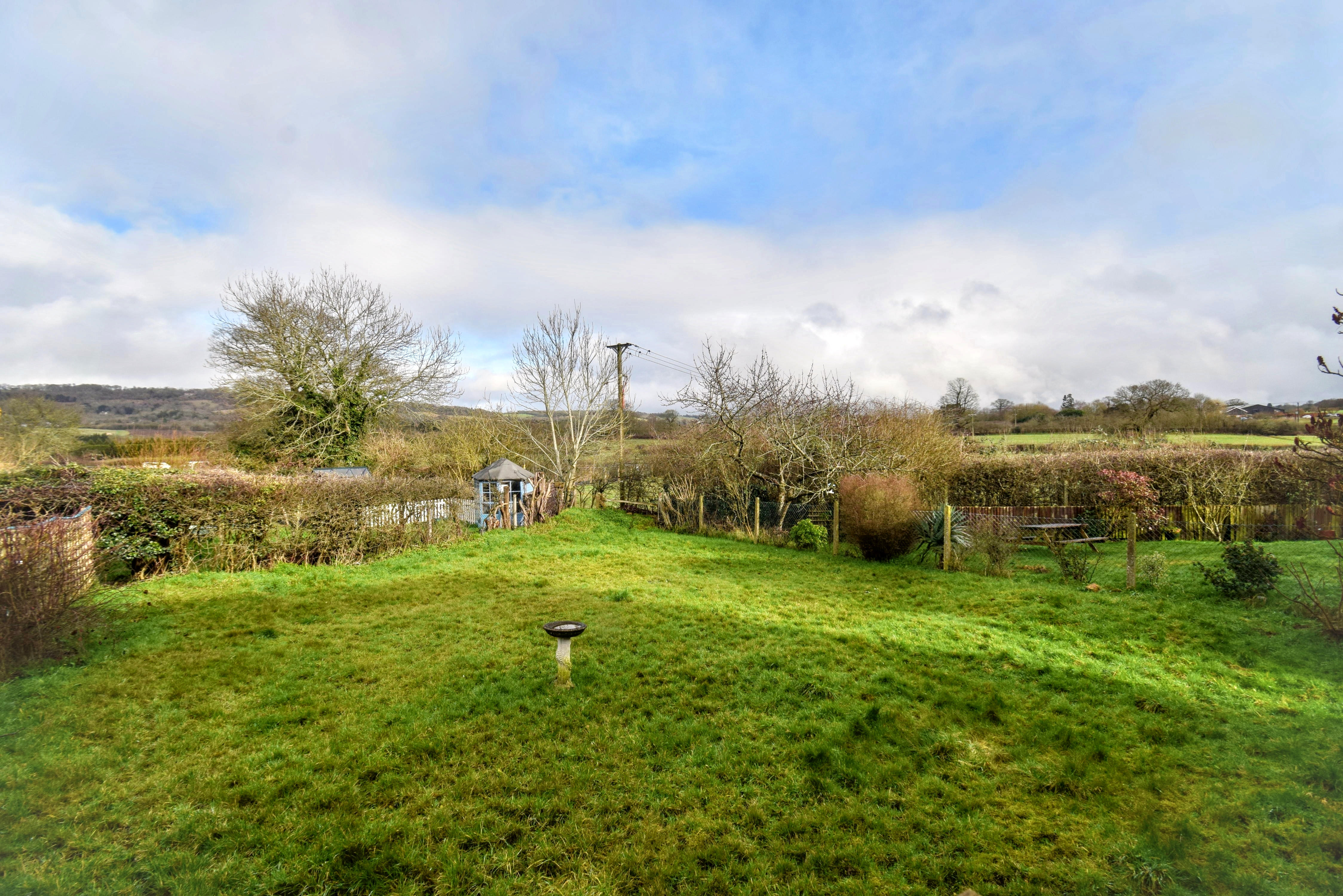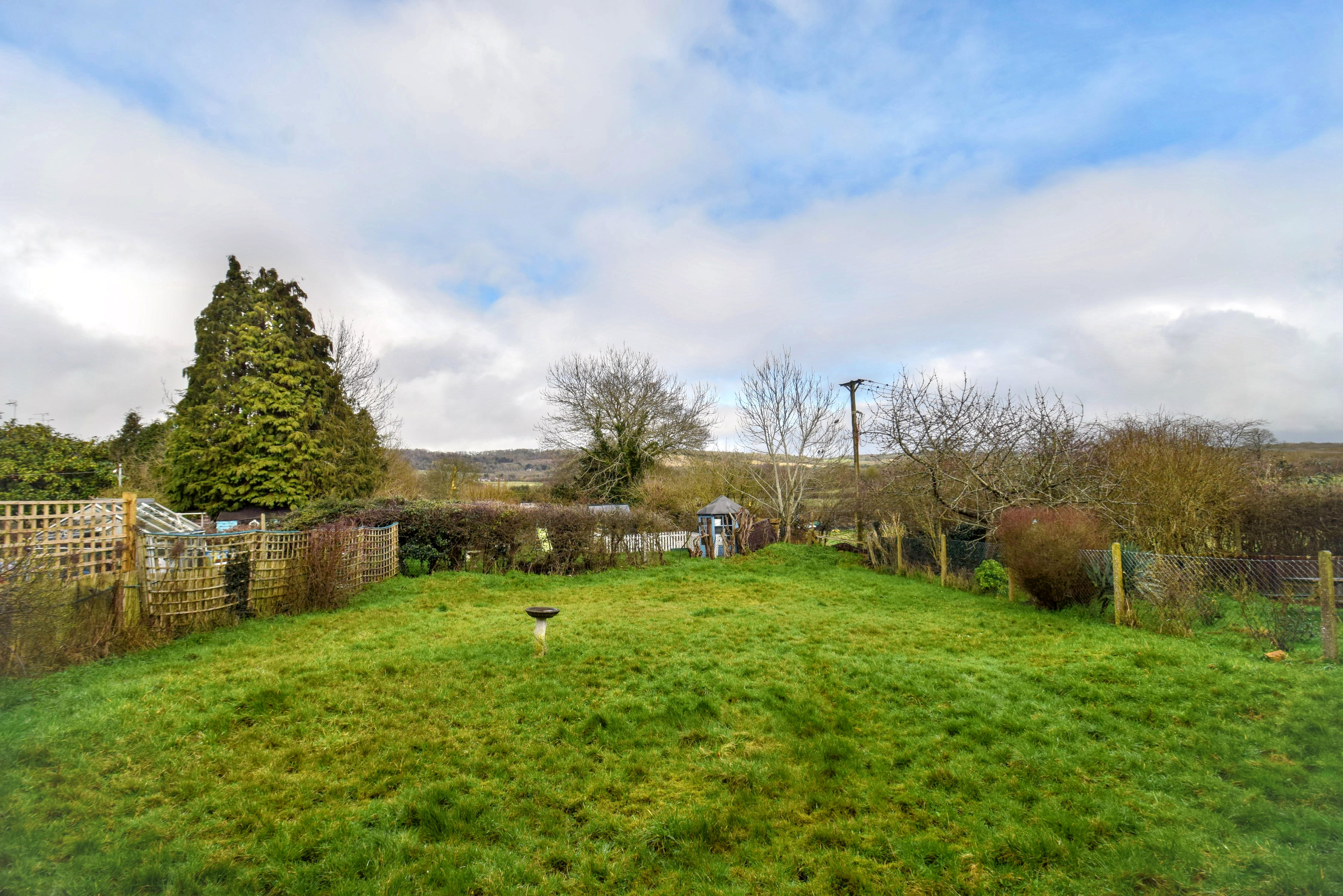 Generously sized rear garden, primarily lawn, with countryside views to the rear. There's side access, a shed, decking and an outside tap.