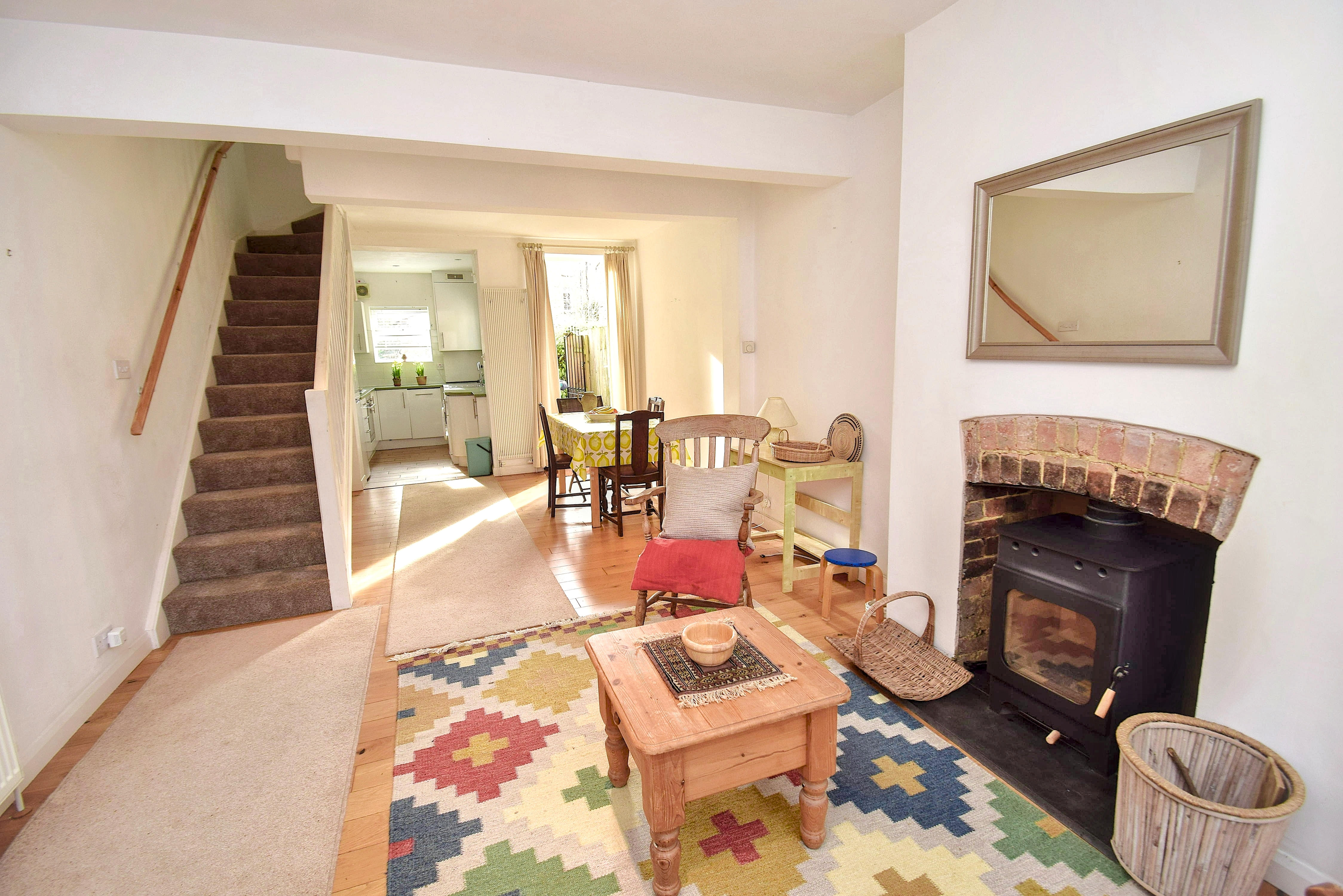 23' 3" x 12' (7.09m x 3.66m) chimney breast fitted with a 8kw wood burning stove, granite hearth, meter cupboard, engineered oak floor incorporating a mat within a mat well, sealed unit double glazed window to the front with obscure glazing to the lower part, radiator, contemporary style wall radiator, stairs to the first floor, halogen down lighting, sealed unit double glazed door leads to the rear, opening leads through to the kitchen.