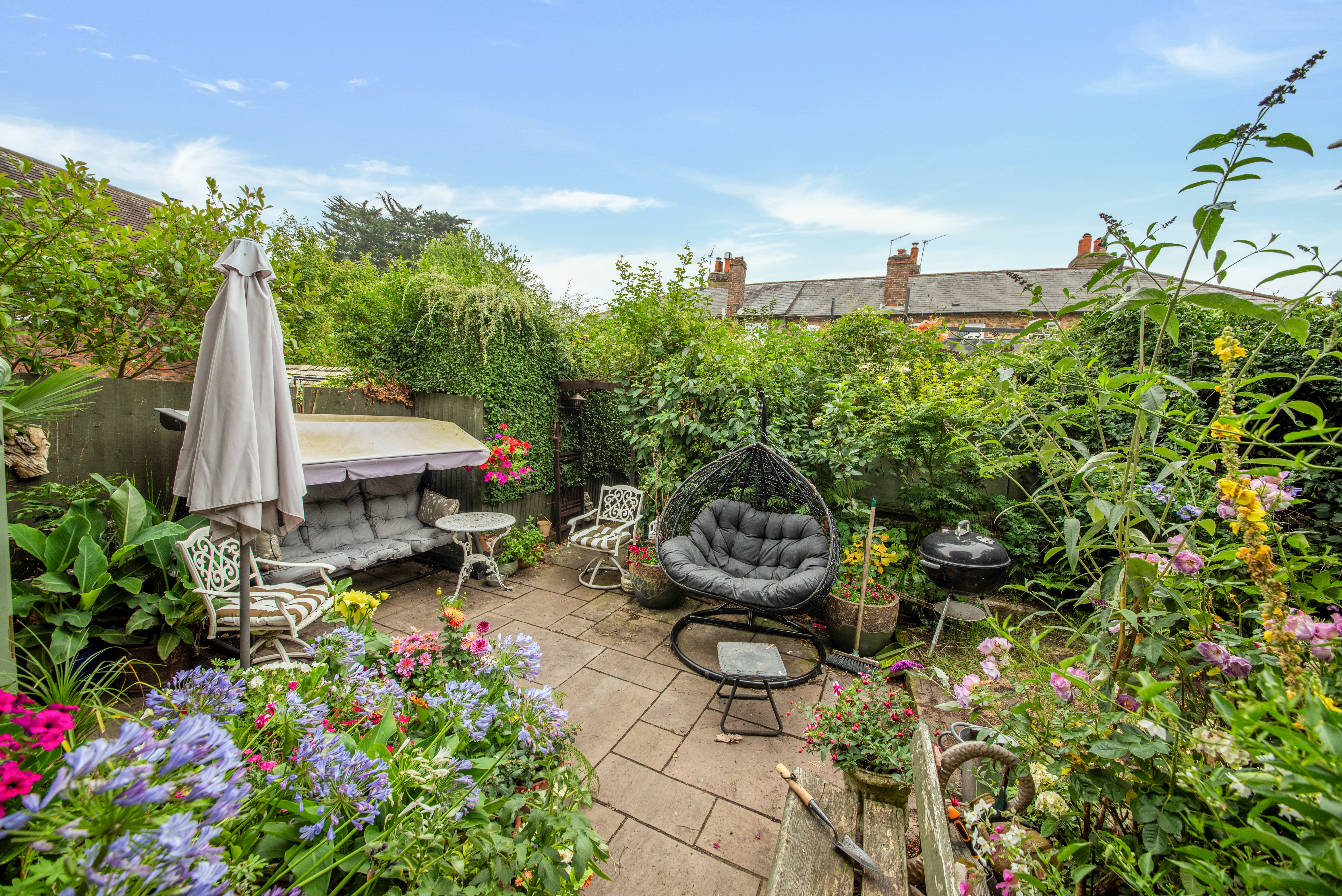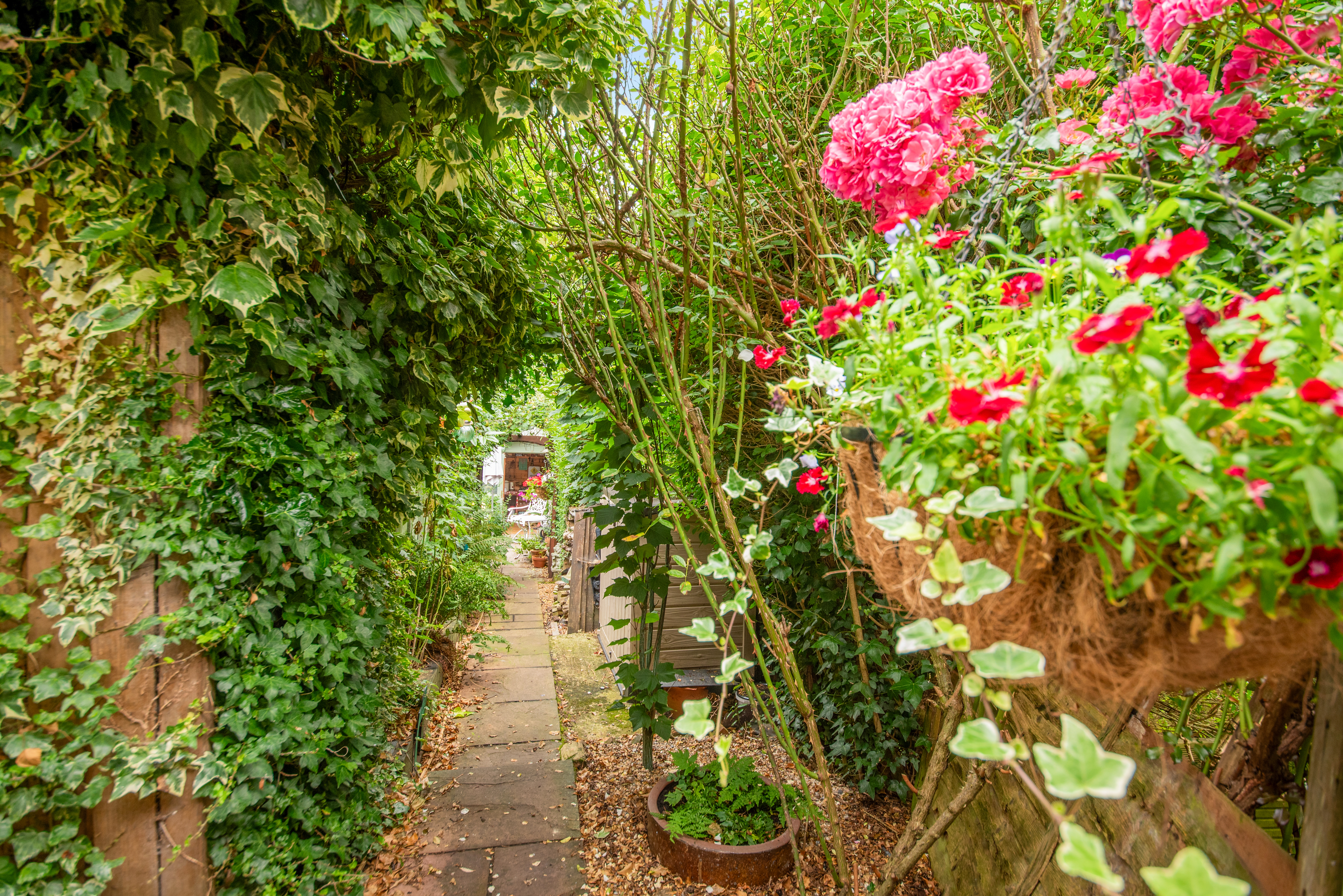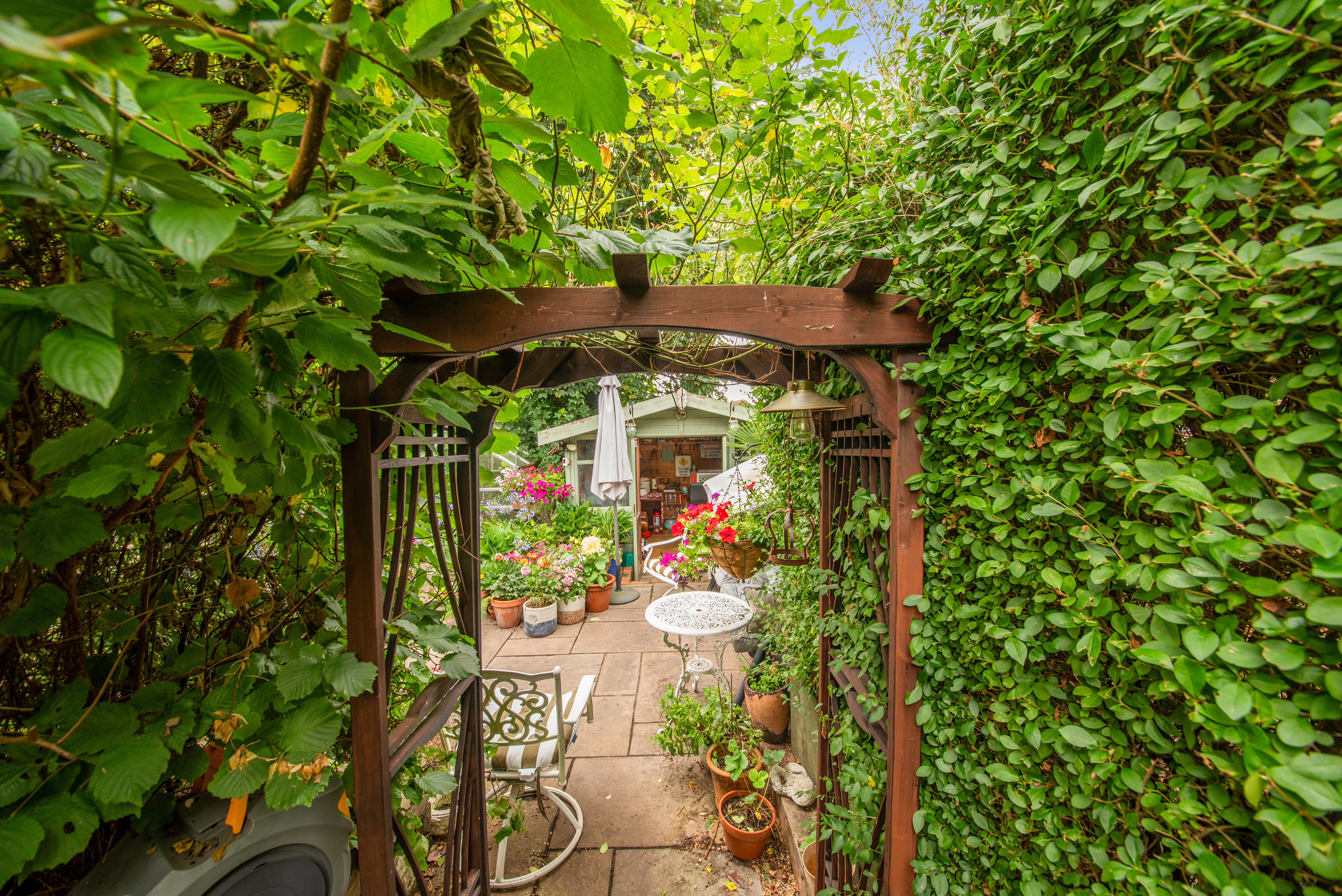 From the garden room, the paved pathway opens out to a private and peaceful oasis, which measures at least 50ft by 30ft. Adorned with an array of colour, the garden is filled with flowers, ferns, shrubs and fruit trees, and is sheltered with mature trees and hedging. There is a patio area which would be perfect for outdoor seating, as well as an area of lawn, a log store, an outdoor tap and a shed. There is a delightful 9'7 by 7'9 summerhouse with power which has been turned into a bar area, ideal for entertaining, to turn into a home office or to make into a playhouse or den.