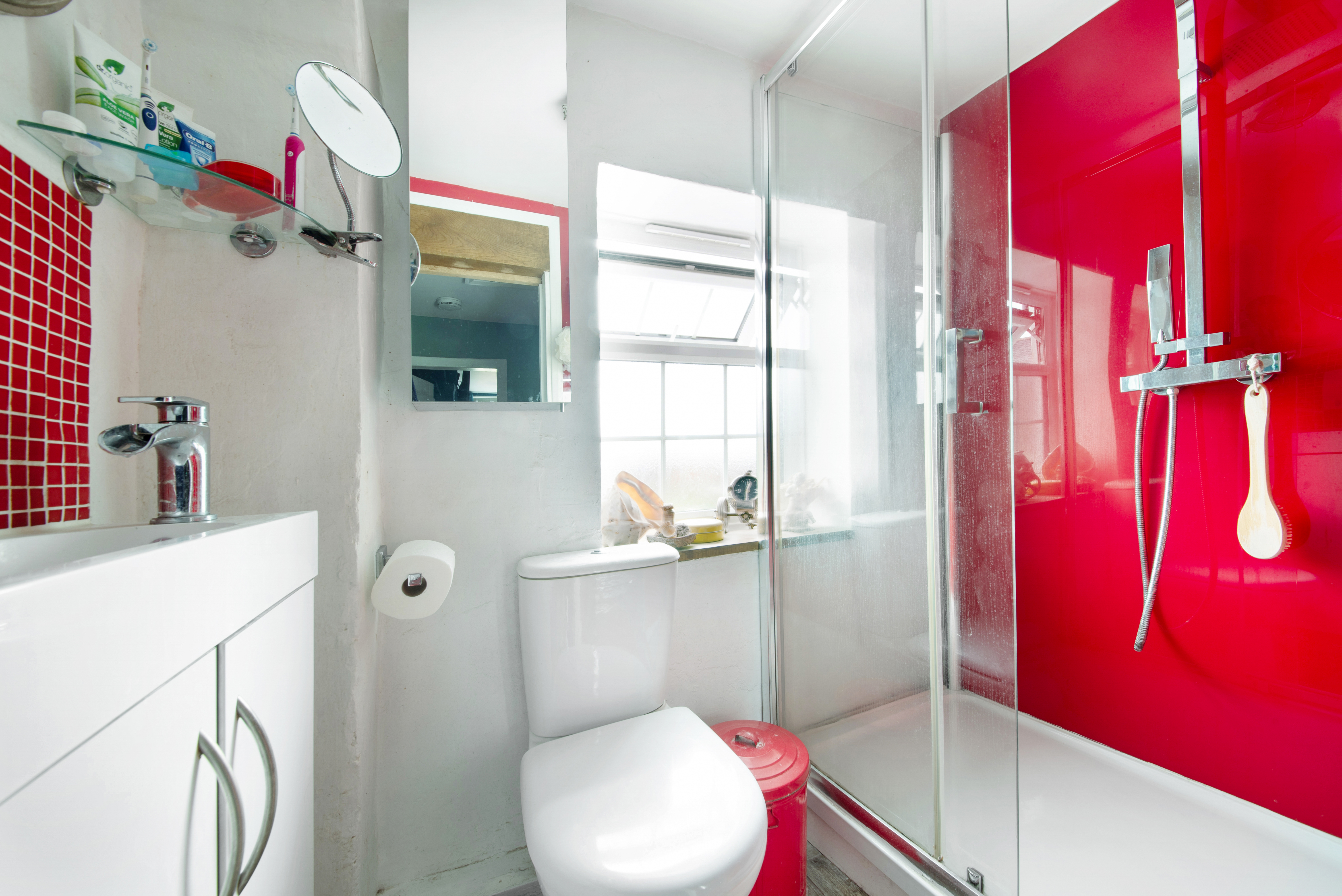 Large step in shower, towel rail, low level WC, wall-mounted mirrored cabinet, double glazed opaque window to the rear, hand wash basin with cupboard beneath and tiled splashback.