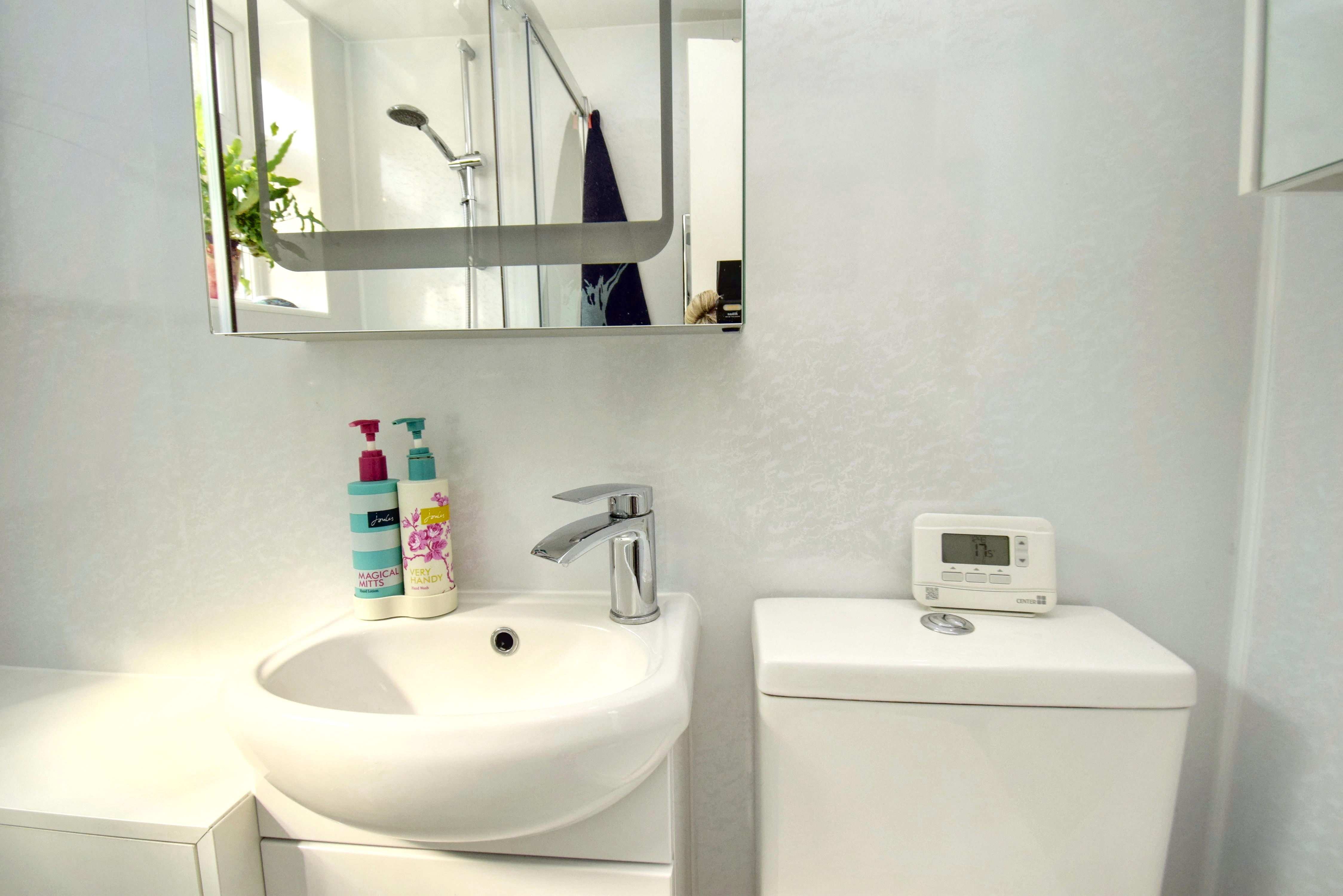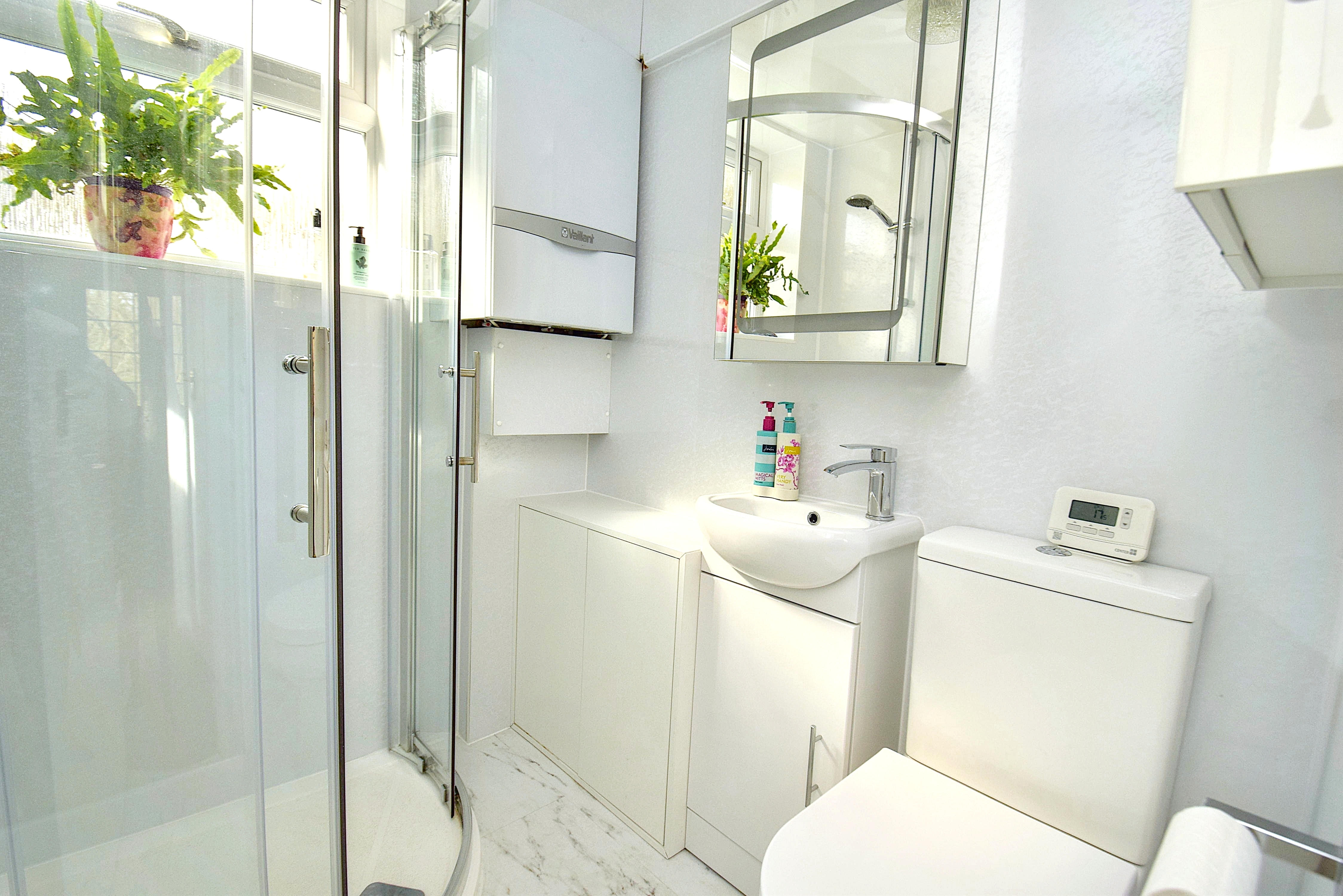 Aqua panelled walls, enclosed shower, double glazed window to rear, low level W.C., vanity unit, mirrored cupboard with light, heated towel rail, laminate flooring, wall mounted Vaillant combination boiler.(updated in 2022)