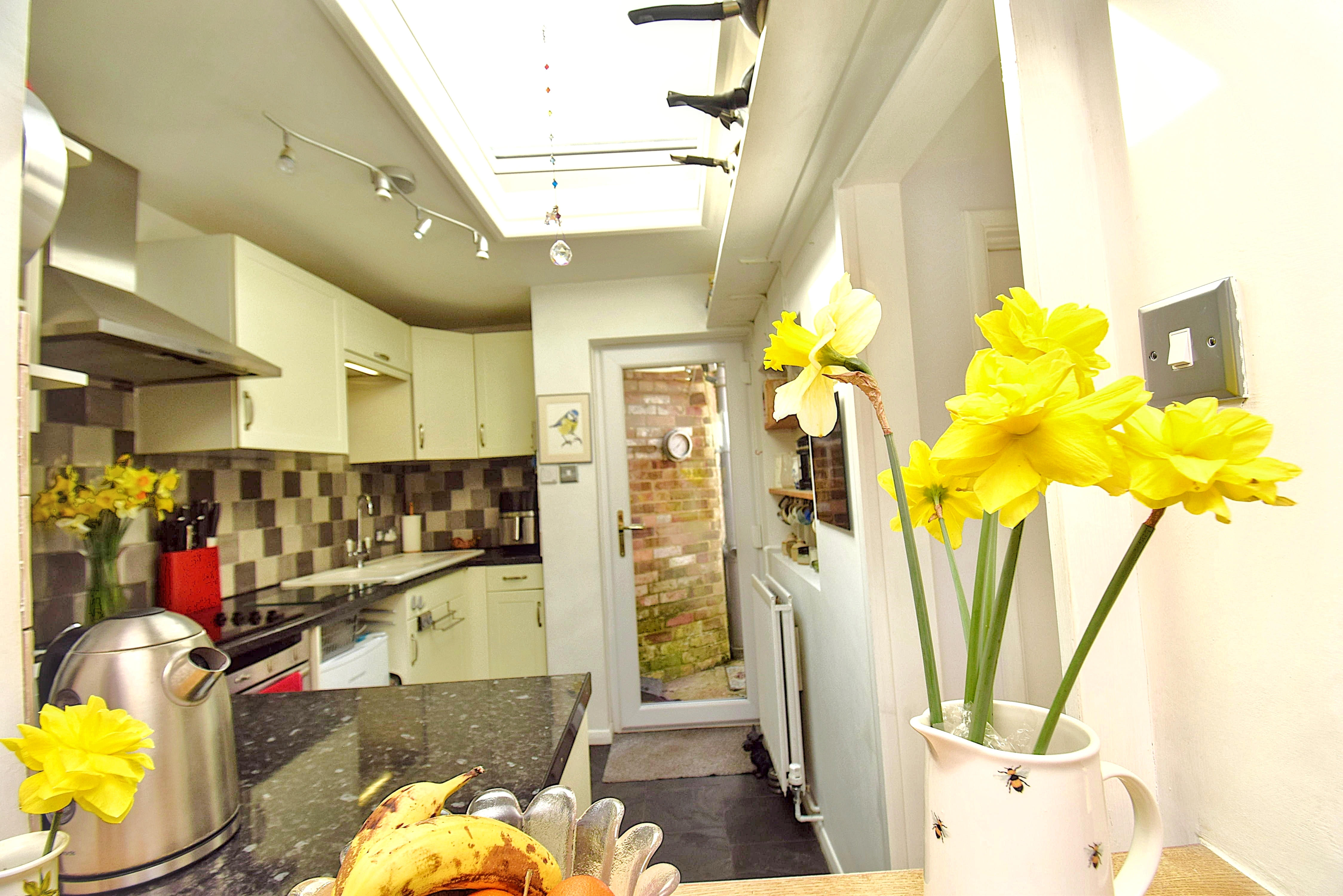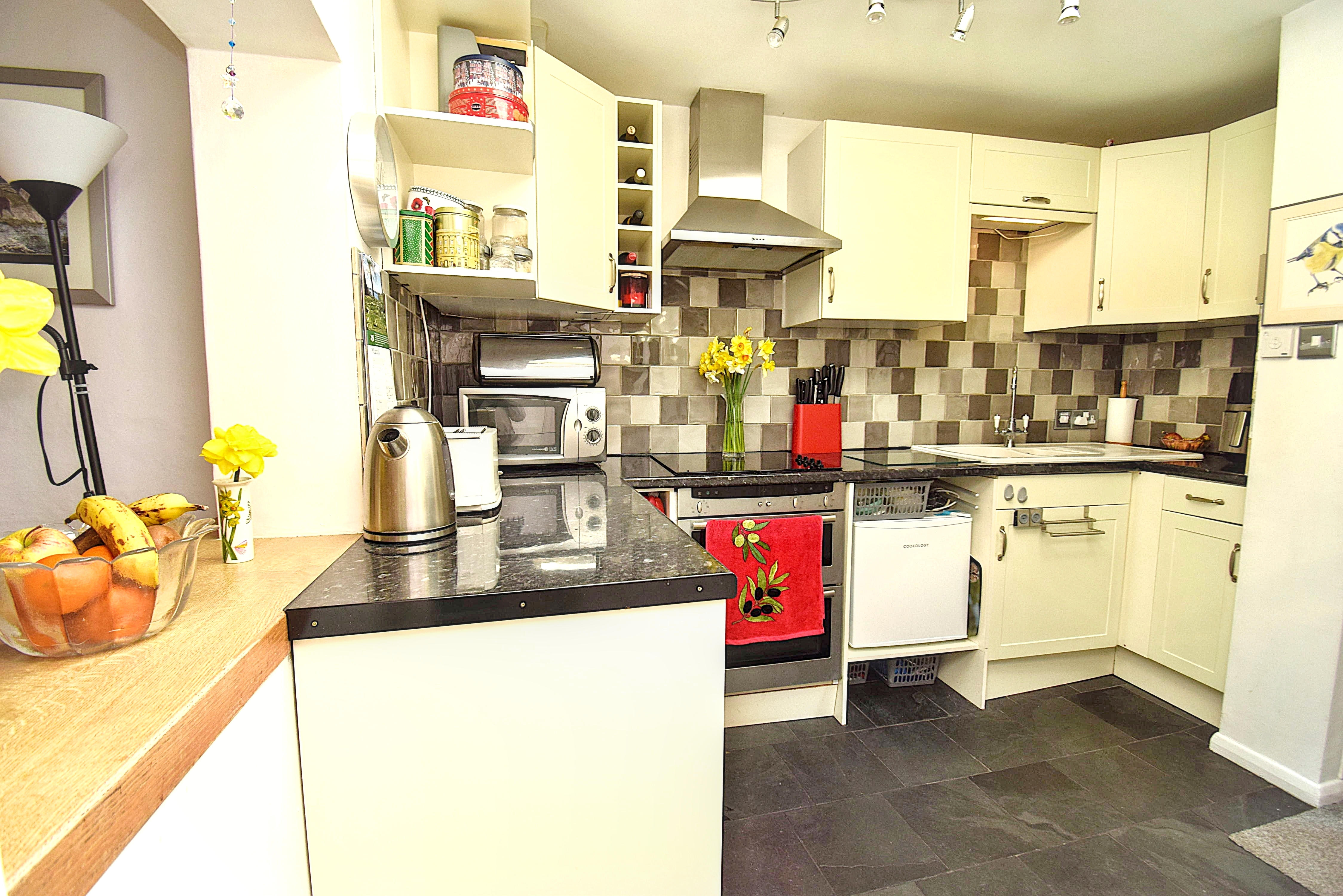 10' 4" x 7' 4" (3.15m x 2.24m) Step up to kitchen, built in electric oven, ceramic hob with extractor over, ceramic sink with drainer, plastic/resin flat roof over kitchen with Velux electric glass skylight self closing rain sensor. A range of matching wall and base units, space for fridge and mini freezer, slate tiled floor, double glazed door to garden, radiator.