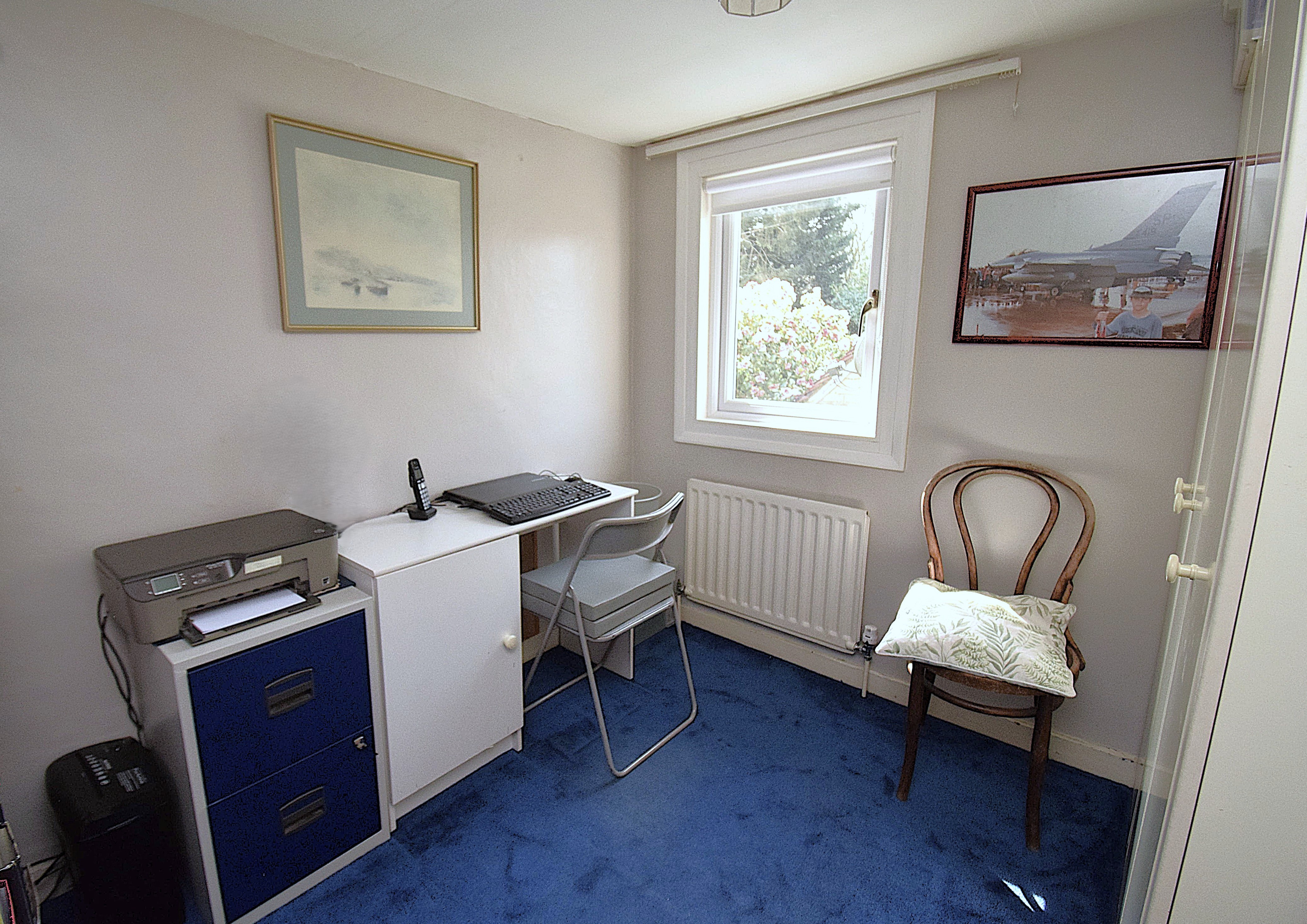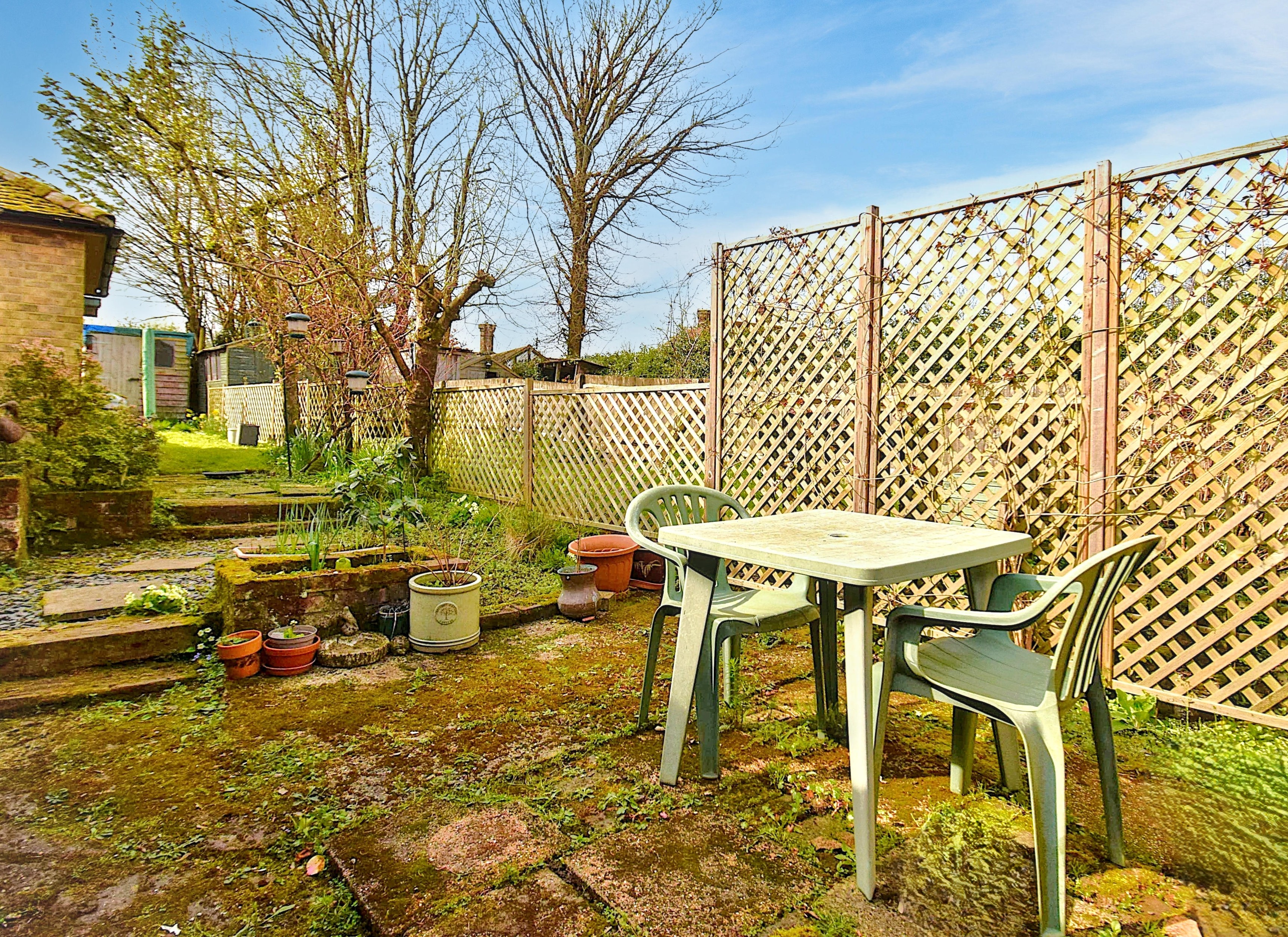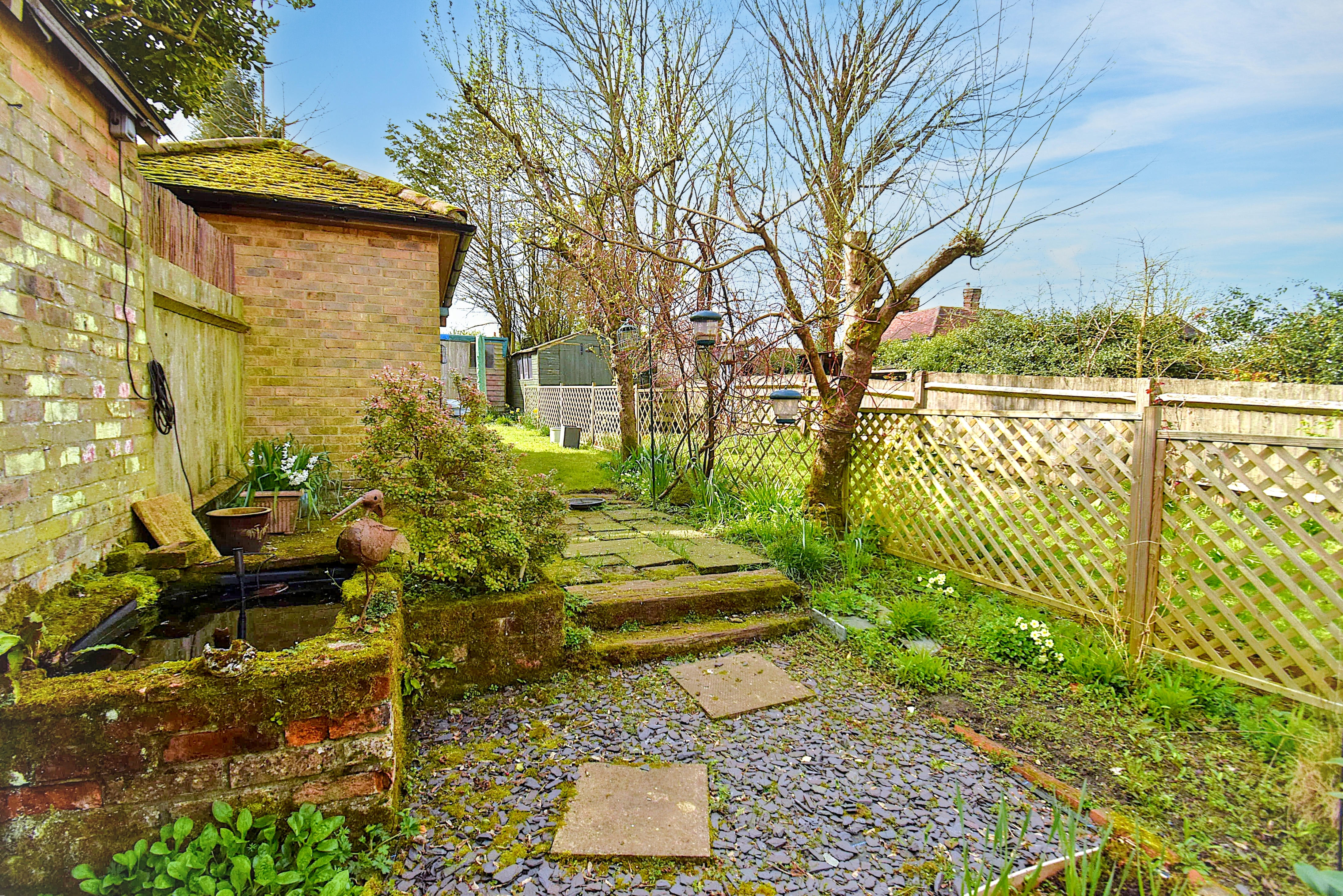 Rear Garden approximately 80ft long with rear gated right of way pedestrian access, two patio areas, door to workshop/utility outbuilding ,feature pond, lawn with pathway leading to timber shed.
