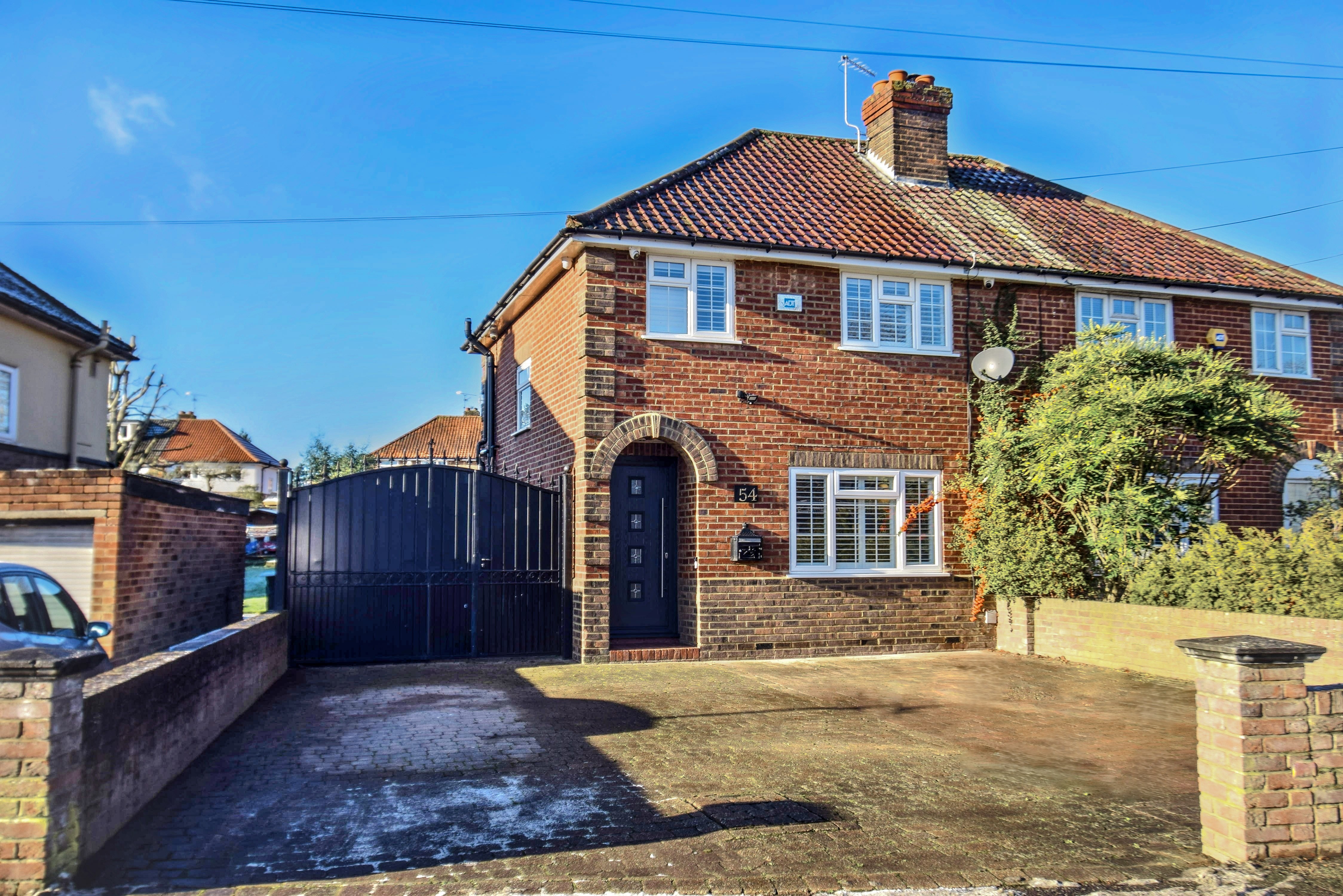 Block paved and providing ample parking space to the front, as well as extending down the side of the property via gates.