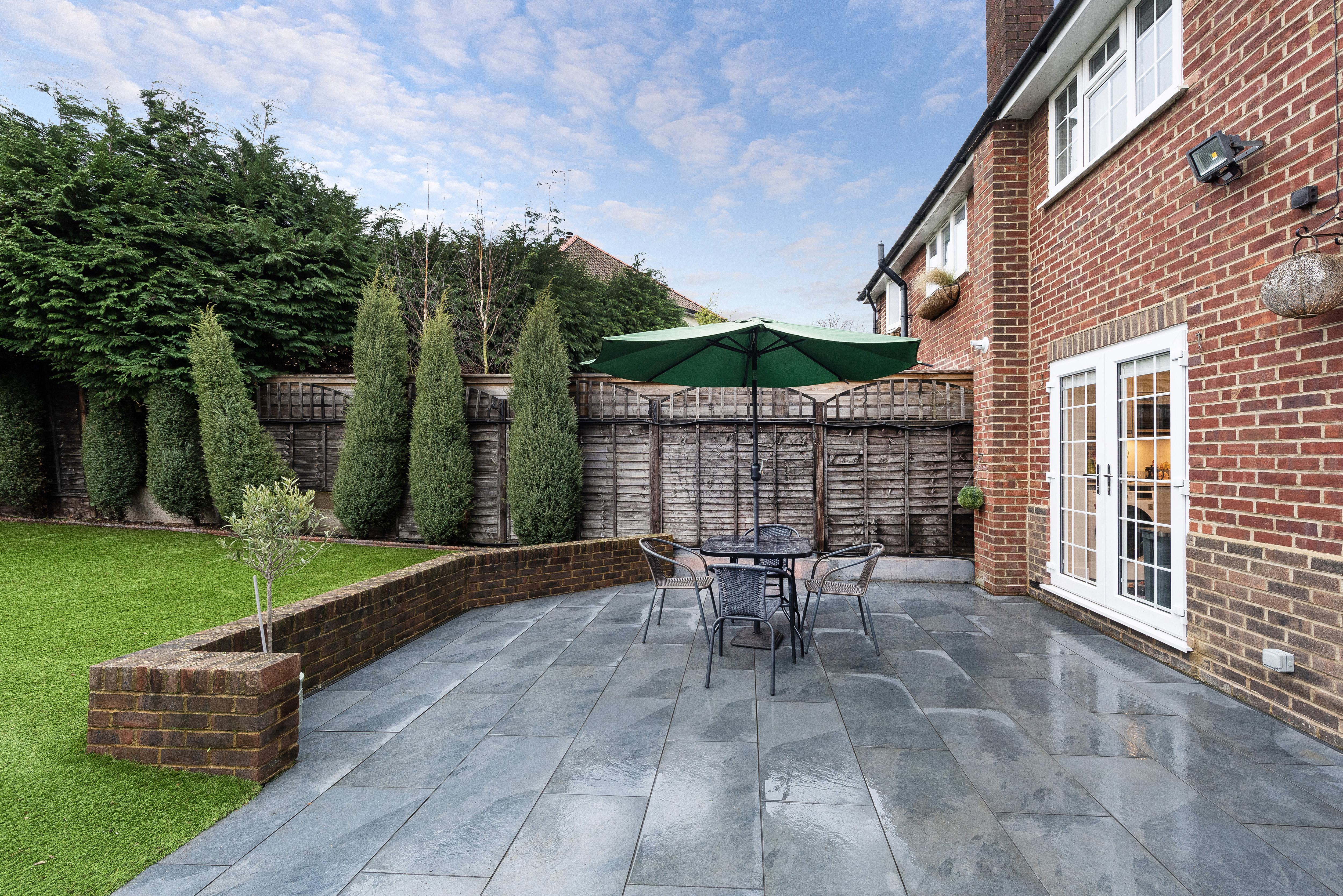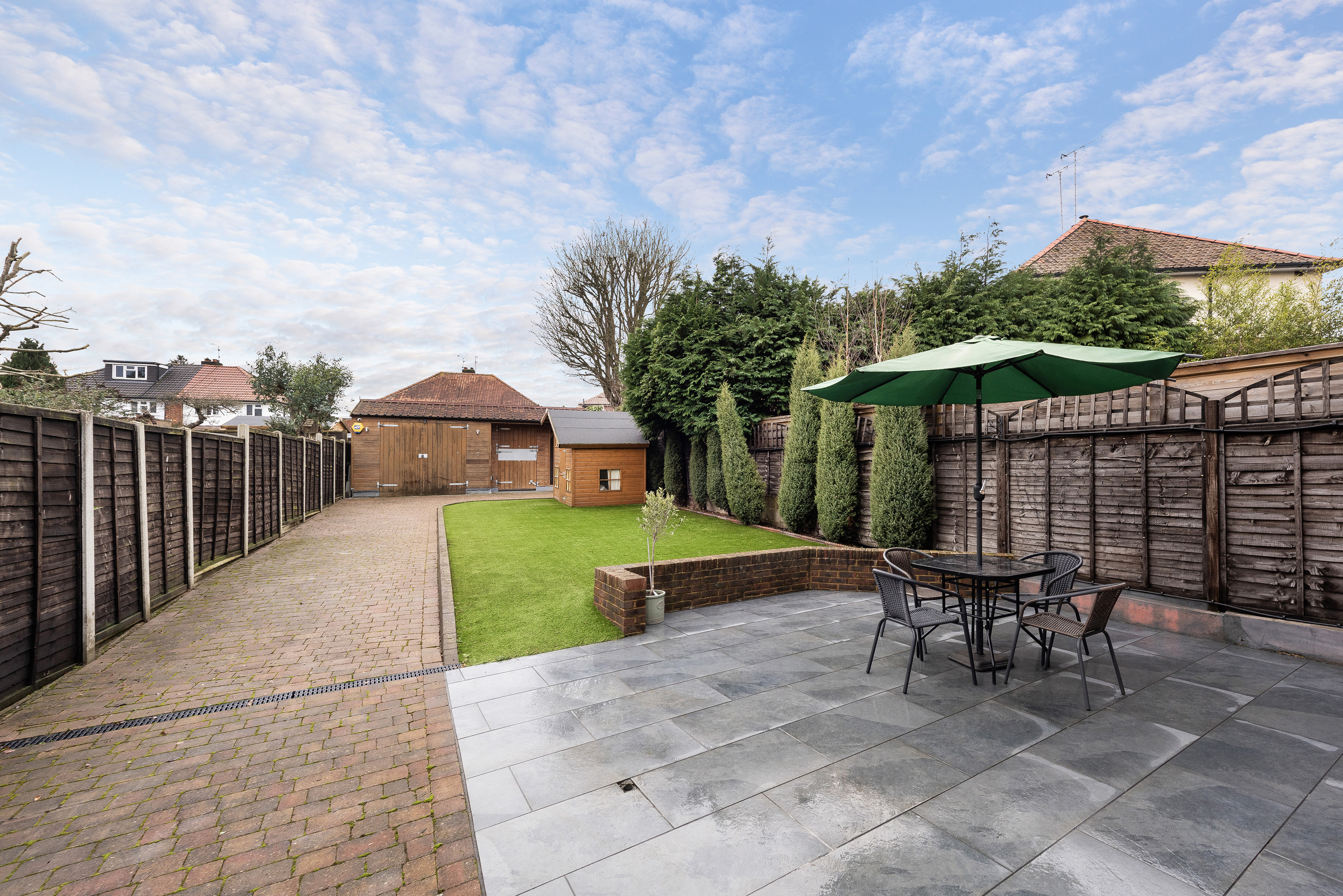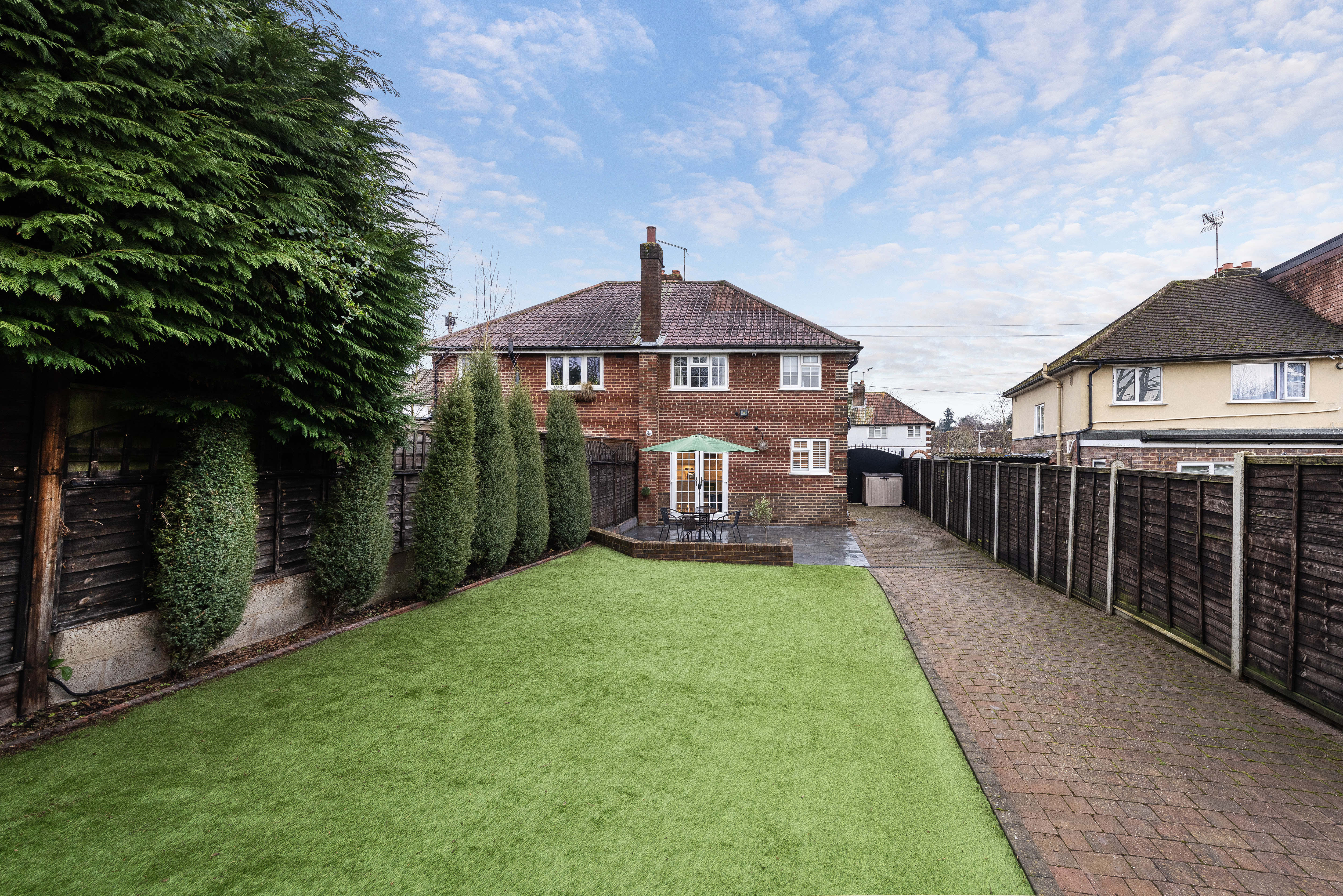 The west facing rear garden extends to approximately 70ft and offers a low maintenance space to enjoy, with block paving along the side, a large patio area ideal for al fresco dining, artificial turf, a wooden playhouse, panelled fencing and a planted border. There is outside lighting and an outside tap.