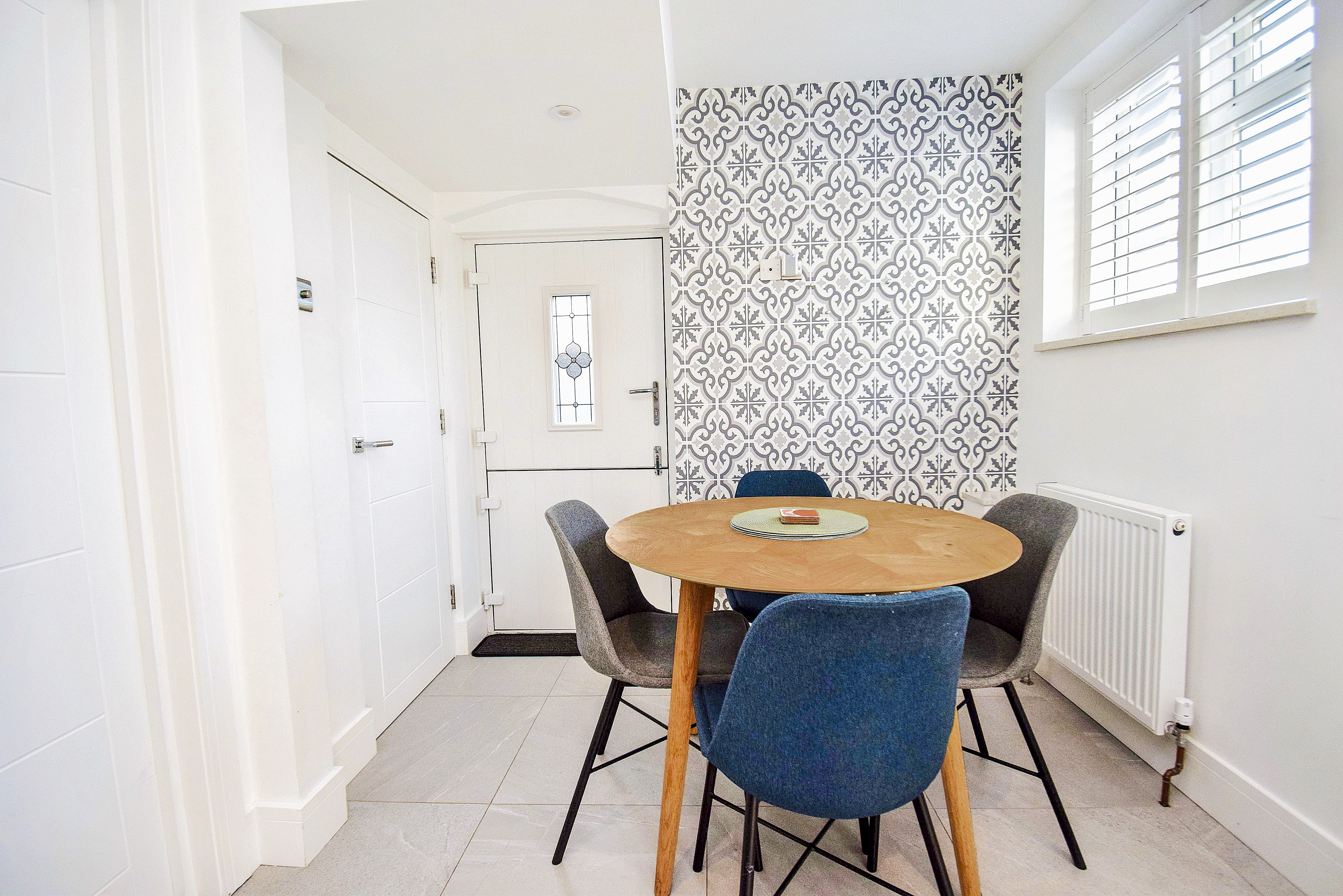 5.25m x 2.38m (17' 3" x 7' 10") Stylish kitchen with space for freestanding dining table and chairs. Matching high gloss wall and base units with quartz worktops , cutlery and deep pan drawers, sink inset to worktop with mixer tap and drainer grooves. Built-in high level microwave, fitted AEG dishwasher, space for washer/dryer, integrated fridge freezer, AEG fitted oven with induction hob and extractor above, cupboard housing Vaillant gas-fired boiler. The kitchen/dining room features tiled flooring throughout, French doors to the garden, a stable door to the side, radiator, cupboard with stopcock, larder cupboard with shelving housing gas and electric meters and consumer unit, double glazed window to rear with plantation shutters.