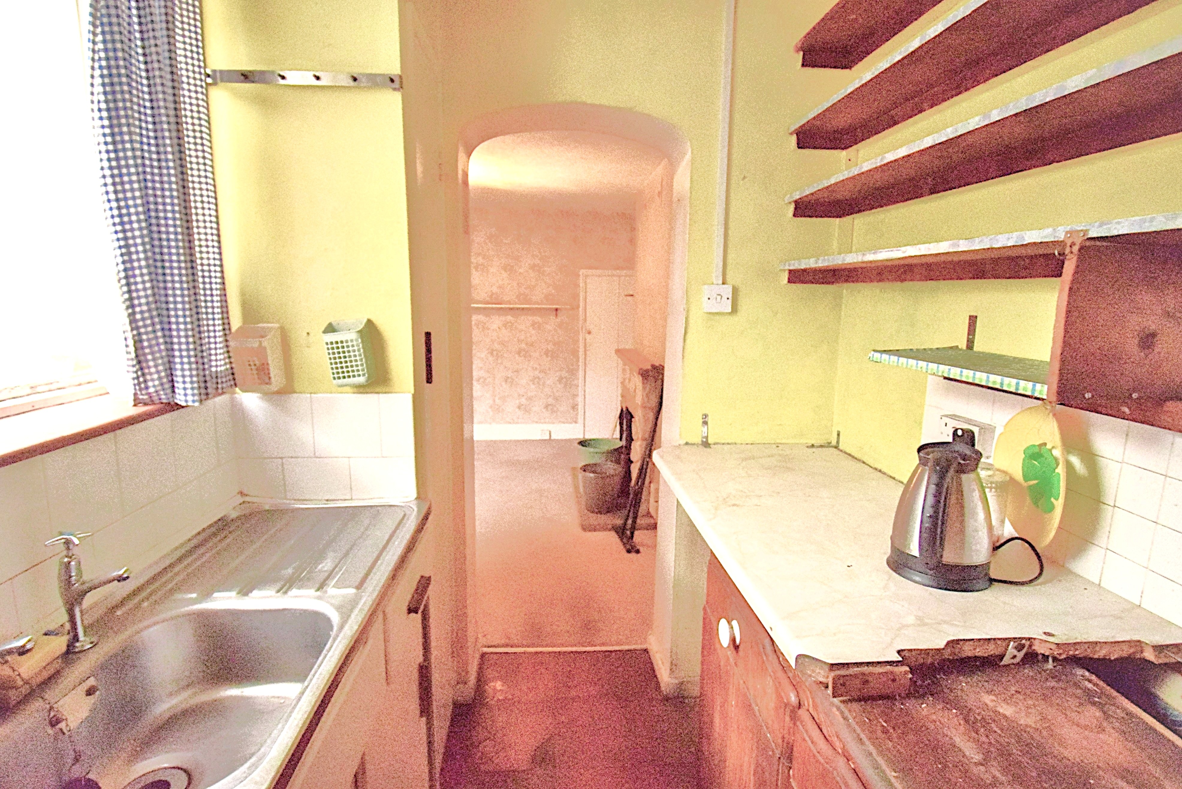 8' 0" x 5' 7" (2.44m x 1.70m) Stainless steel single drainer sink unit, shelving and freestanding cupboard work top, larder cupboard, plumbing for washing machine, Window and door to side.
