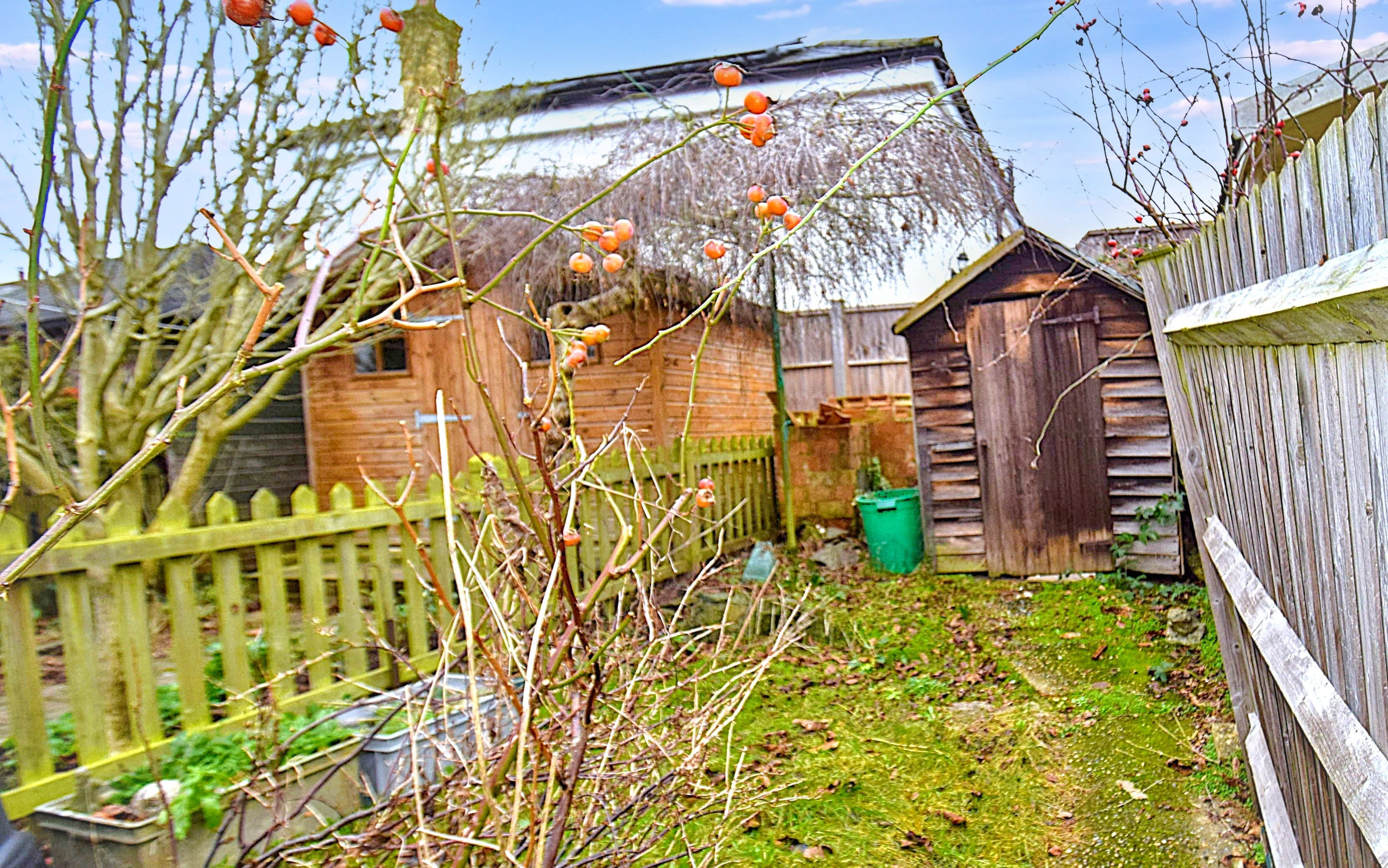Enclosed area of rear garden with shrubs and timber garden shed.