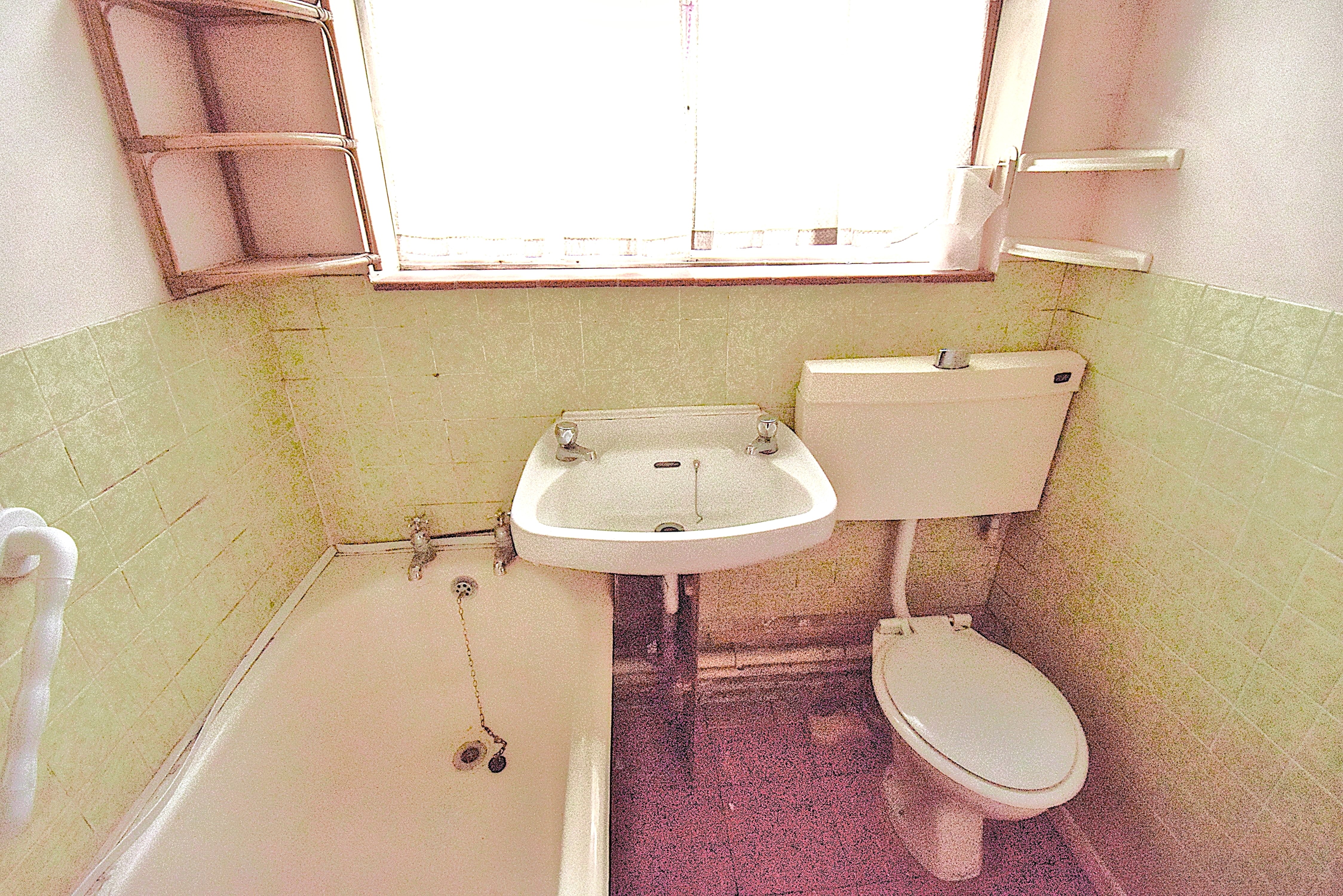 5' 6" x 5' 3" (1.68m x 1.60m) Bath, wall mounted wash hand basin, low level W.C., secondary glazed window to rear, part tiled walls..